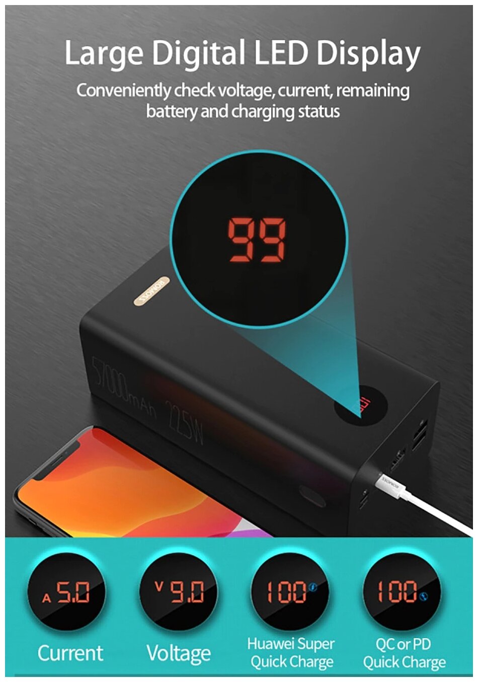 Этот монстр-зарядка обладает огромной емкостью 60000 мАч, что позволяет зарядить ваш смартфон до 10-15 раз, планшет - до 5-6 раз, а ноутбук - до 2-3 раз! Такого запаса заряда вам точно хватит на долгие поездки или на случай, если вы останетесь без доступа к розетке.