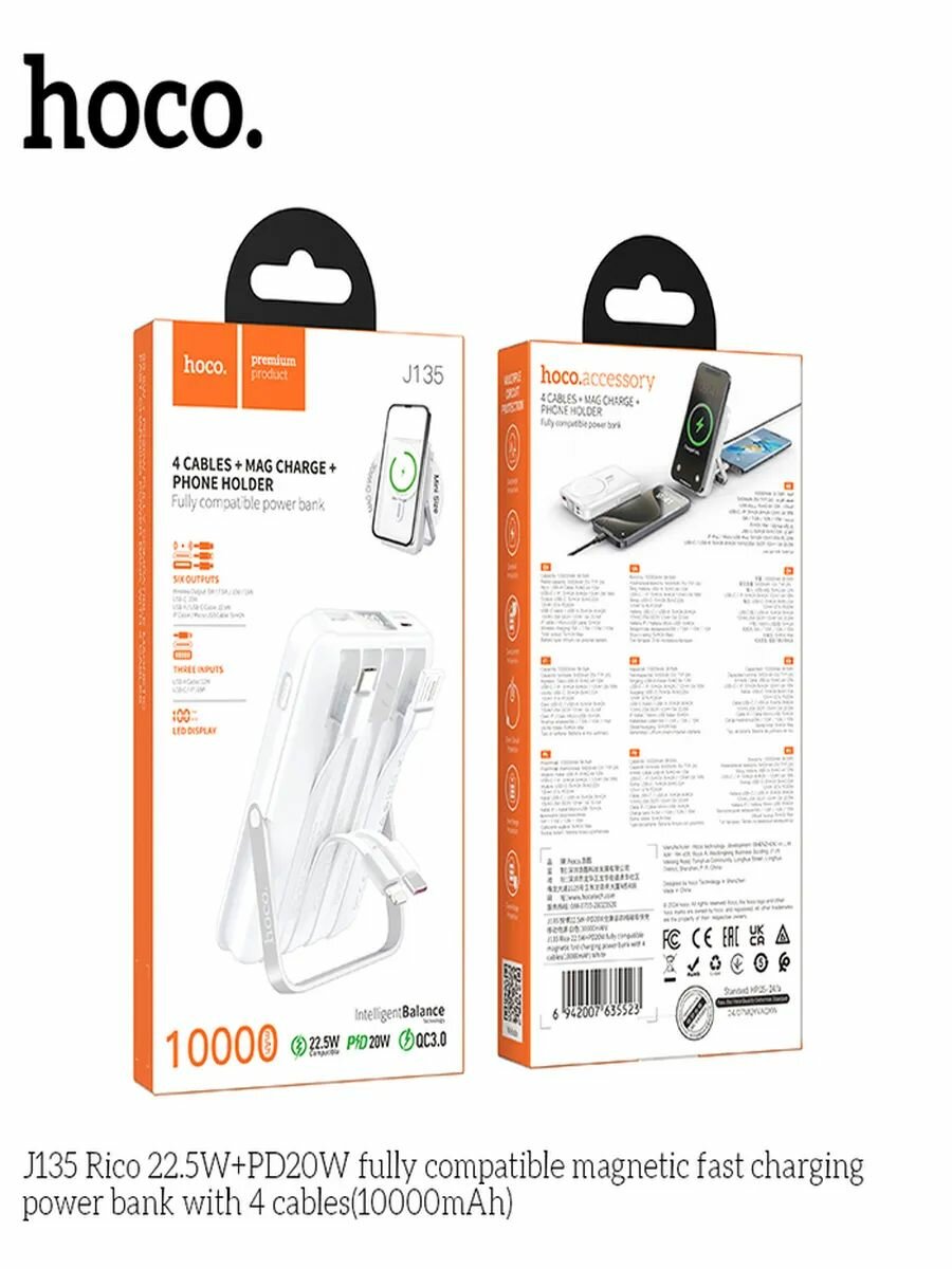 Купить Внешний аккумулятор с Magsafe Hoco J135 10000mAh 22.5W + PD 20W + QC3.0 с 4 встроенными кабелями белый с доставкой по всей России. Внешний аккумулятор с Magsafe Hoco J135 10000mAh 22.5W + PD 20W + QC3.0 с 4 встроенными кабелями белый: сравнение цен, характеристики, фото, актуальное наличие и цены.