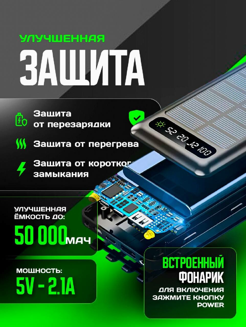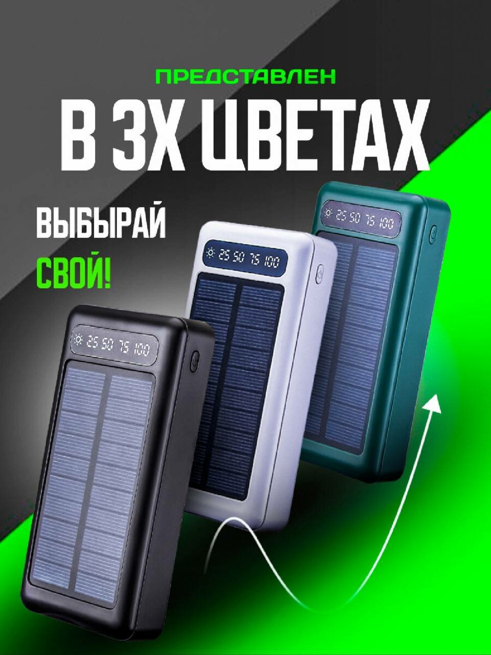 Популярная модель Solar Charger 100000 mAч. Внешний аккумулятор обладает повышенной ёмкостью АКБ 100000 мАч и обеспечит до 20 полных зарядок современного смартфона. Повербанк обеспечит возможность резервной подзарядки, когда нет доступа к электрическим розеткам 220В. Имеется индикация заряда, фонарик. Не нужно теперь носить с собой кучу кабелей и разъемов наш пауэрбанк Solar Power универсален и практичен. Индикация заряда, фонарик, встроенные кабели станут незаменимыми помощниками как в повседневной жизни, так и в путешествии, на рыбалке или просто на отдыхе. Предназначен повербанк для телефона iphone android, а так же для смарт часов, планшета, зарядит наушники, беспроводные зарядки и многое другое. Совместим с iPhone 6, iPhone 6S iPhone 7, iPhone 8, iPhone X, iPhone Xr, iPhone Xs, iPhone Xs max, iPad, iPhone 11, IPhone 11 pro max, IPhone 12, iPhone 12 pro, IPhone 12 pro max, IPhone 13, IPhone 13 pro, IPhone 13 pro max , iphone 14. Дисплей с цифровой шкалой уровня заряда показывает состояние заряда аккумулятора в процентах. Имеет основные уровни защиты: защита от перепадов и скачков напряжения, от перезаряда, от перегрева, от полной разрядки. Данное портативное зарядное устройство для телефона входит в число лучших по показателю цена - качество. Надежный powerbank позволит весь день пользоваться различными гаджетами, а удобная ручка поможет с переноской.