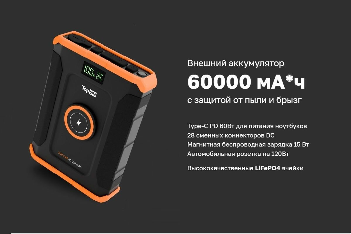 Внешний аккумулятор TopON TOP-X60 60000mAh DC 90W, 2 Type-C PD 60W и 30W, USB QC3.0 18W, Qi 15W, авторозетка 120W, фонарь, защита от брызг, LiFePO4.