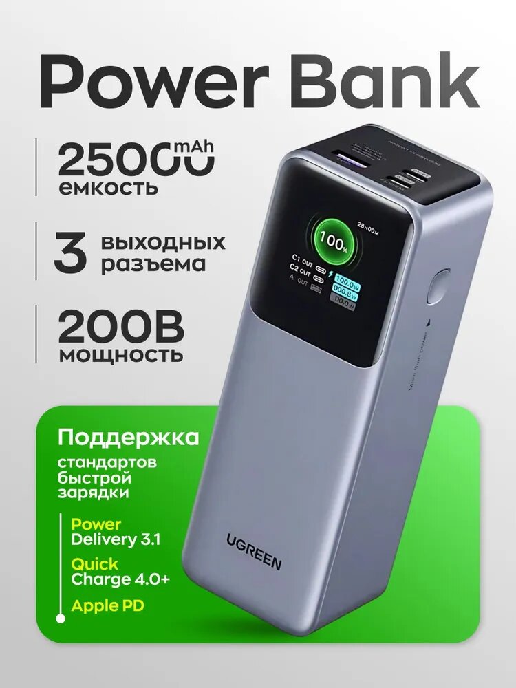 Внешний аккумулятор Ugreen25000 мАч, быстрое зарядное устройство, 200 Вт, серый: сравнение цен, характеристики, фото, актуальное наличие и цены.