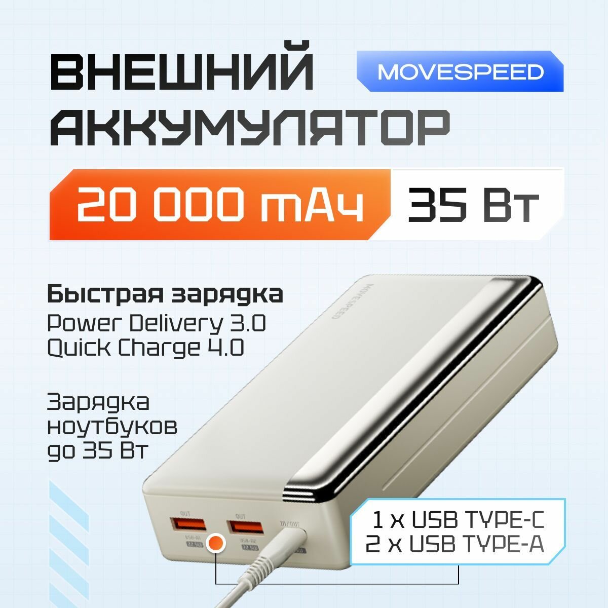 Внешний аккумуляторPower Bank Movespeed 20000 мАч YSPBK20-35 White: сравнение цен, характеристики, фото, актуальное наличие и цены.