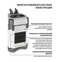 Фильтр Pacific 1000 имеет три секции для фильтрующих материалов и шесть ступеней очистки, осуществляет как механическую, так и биологическую очистку воды. Керамический наполнитель и биошары необходимы для распределения потока воды в фильтре и служат поверхностью для расселения полезных нитрифицирующих бактерий, которые перерабатывают продукты жизнедеятельности рыб, такие как аммиак и нитриты.