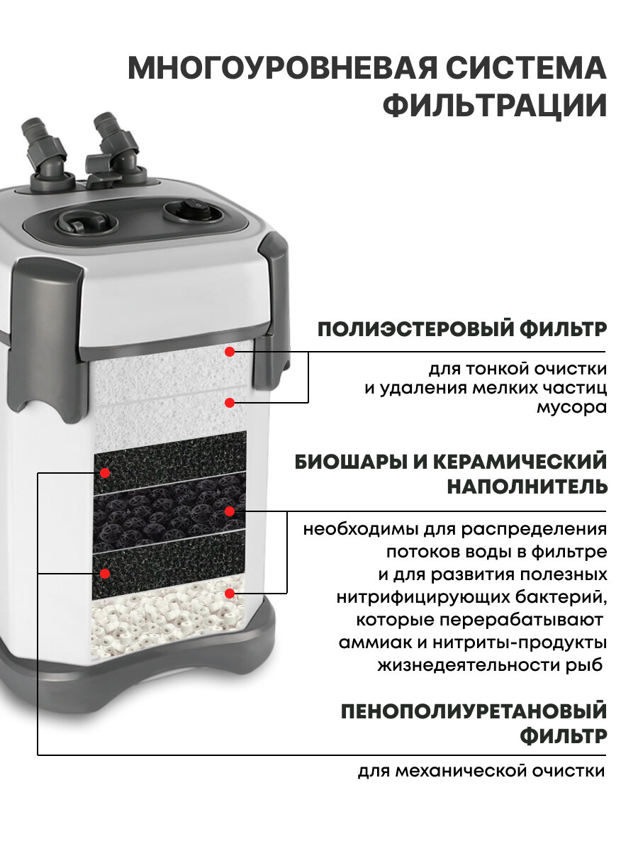 Внешний фильтр для аквариума поможет обеспечить идеальные условия для жизни рыбок и других обитателей мира аквариумистики! Фильтр обеспечит идеальную фильтрацию воды в аквариумах, удаляя все загрязнения и обеспечивая надлежащую аэрацию. Предназначен для аквариумов от 150 до 300 литров. Для аэрации воды устанавливается только выпускная трубка с воздушной трубкой. При такой установке трубка с распылителем воды не устанавливается. Совместно эти насадки работать не будут.