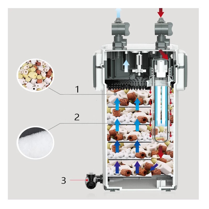 Особенности продукта: Быстрая очистка воды, многократная фильтрация;Удаляет масляную пленку, подавляет бактерии и удаляет водоросли;Контролируемый расход, экономия энергии и энергосбережение;Модель в фильтре серии U3 - 3 лотка под наполнители, в серии U5 - 5 лотков под наполнители;Наполнители не входят в комплект поставки;