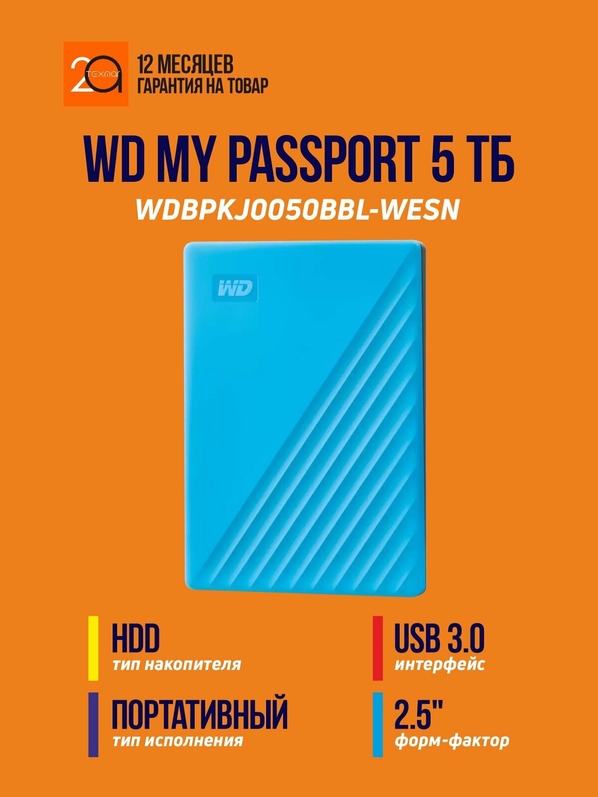 Внешний накопитель HDD Western Digital My Passport 5 Тб USB 3.2 Gen 1, голубой: сравнение цен, характеристики, фото, актуальное наличие и цены.