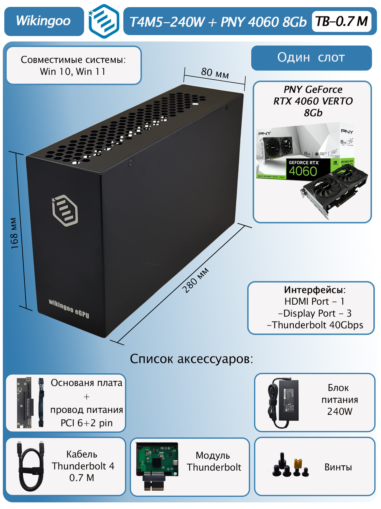 Внешняя видеокарта EGPu Wikingoo T4M5 — 240W + PNY GeForce RTX 4060 8Gb. Thunderbolt 3/4.: сравнение цен, характеристики, фото, актуальное наличие и цены.