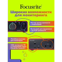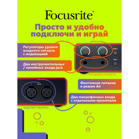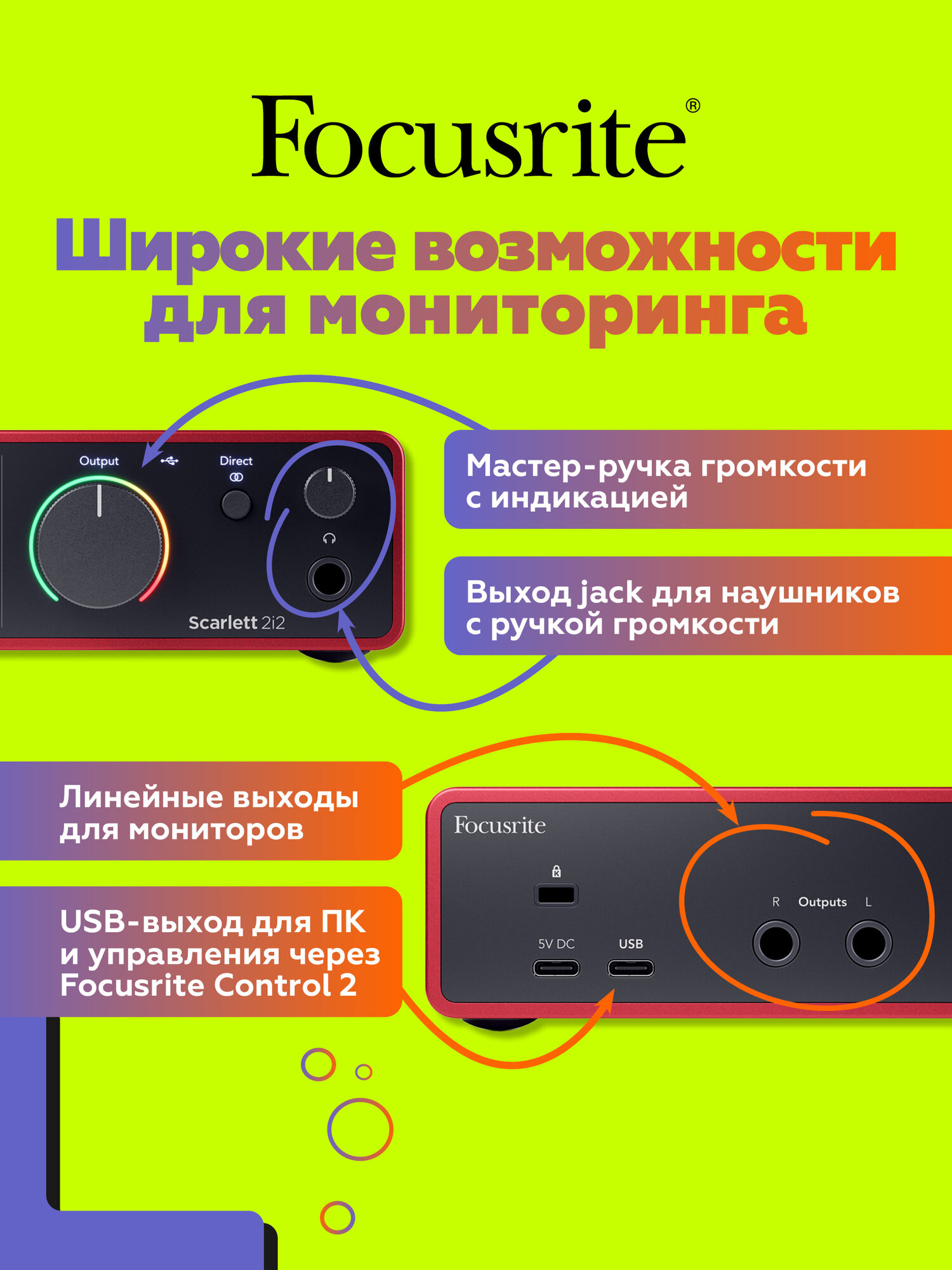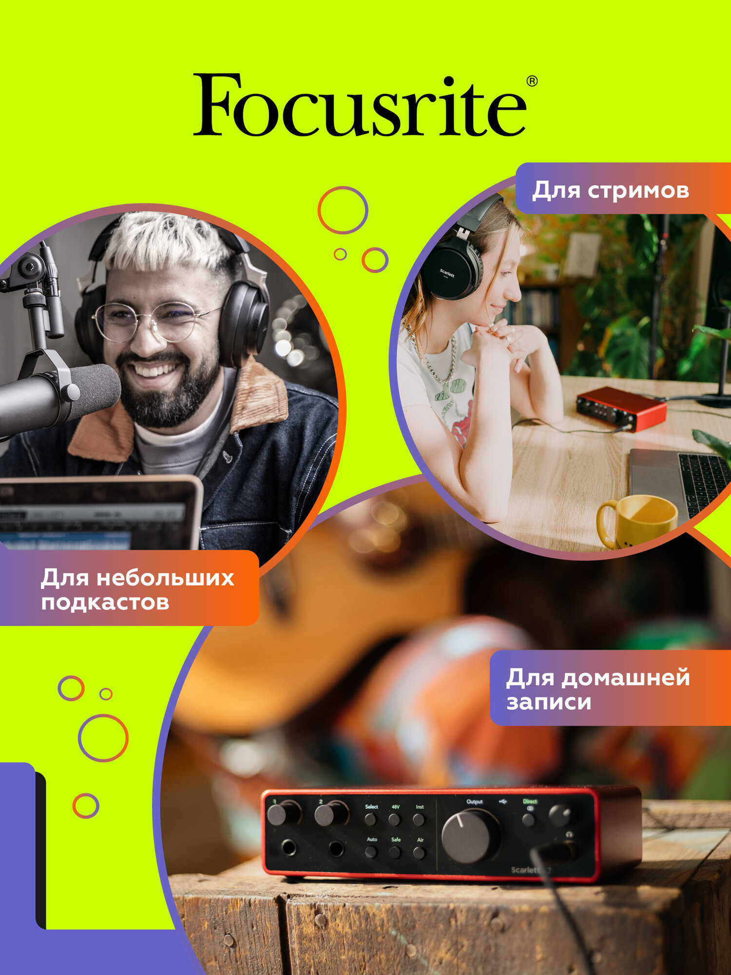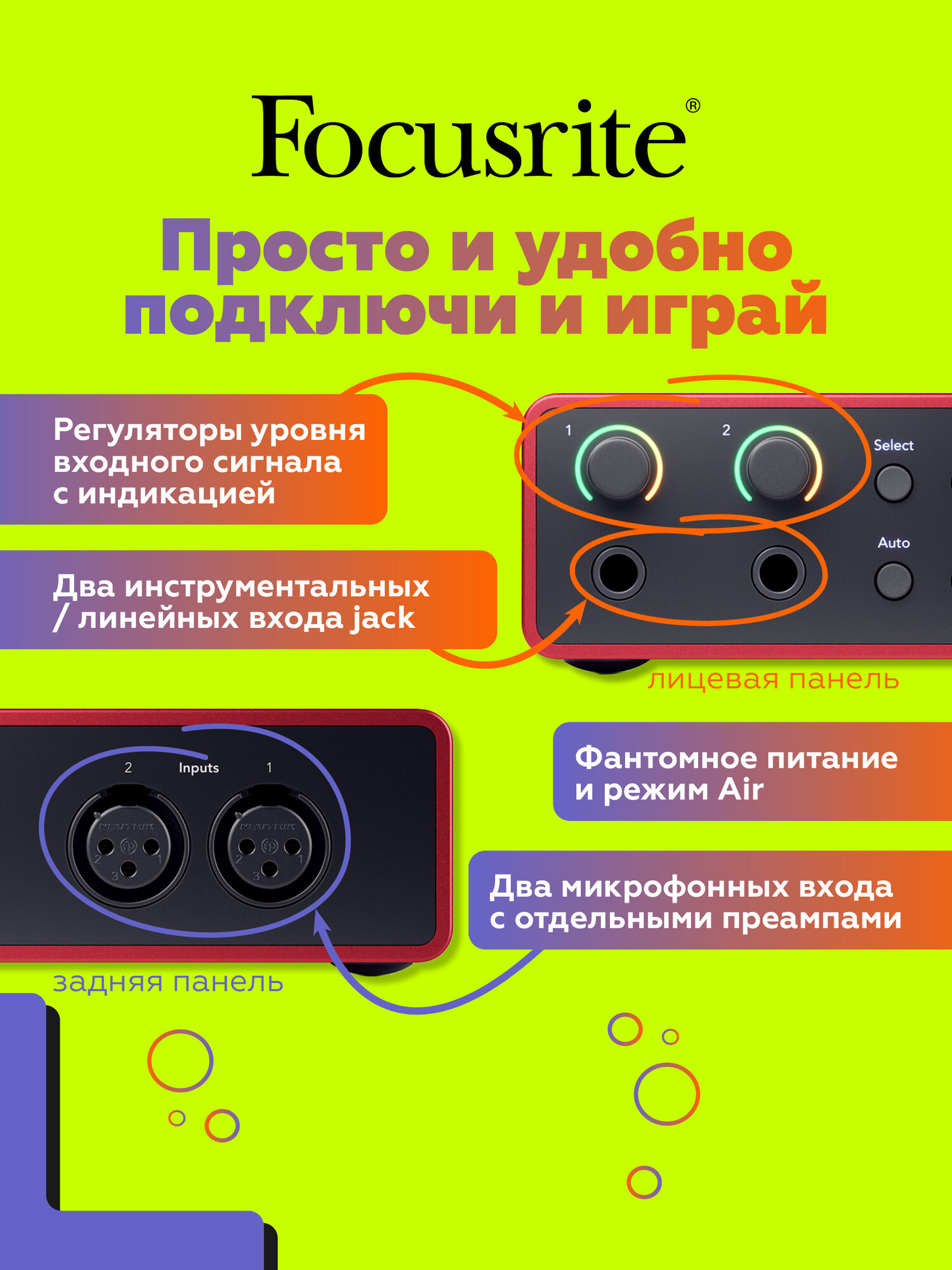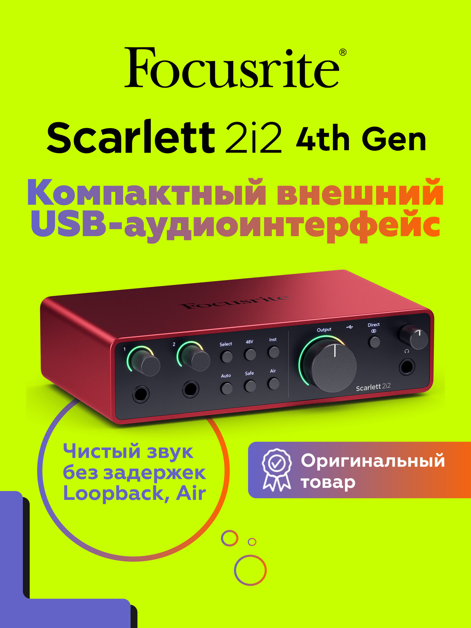 Scarlett-2i2-4th-gen Аудио интерфейс USB, 2 входа-2 выхода, Focusrite Scarlett 4-го поколения получил награду Sound On Sound 2024 года за лучший аудиоинтерфейс. Оригинальный интерфейс студийного качества с двумя входами и двумя выходами был обновлен для настоящих художников. Два наиболее детализированных микрофонных предусилителя со сверхмалым шумом. Высококачественные линейные входы Hi-Z для гитар, клавишных и синтезаторов. Конвертеры студийного уровня с огромным динамическим диапазоном 120 дБ, который соответствует тому, что вы найдете в профессиональной студии. Автоматическое усиление и Clip Safe гарантируют, что вам никогда не придется беспокоиться о своих уровнях. Режим Air с функциями Presence и Harmonic Drive обеспечивает мощный консольный звук, где бы вы ни проводили запись. А пакет программного обеспечения Hitmaker Expansion включает в себя все инструменты, необходимые для записи, производства и выпуска ваших треков. Два самых детальных и сверхмалошумящих предусилителя. Подключитесь к предусилителям 4-го поколения 2i2 — самым чистым и детальным из когда-либо созданных Scarlett, с огромным диапазоном усиления 69 дБ, чтобы получить максимум от каждого микрофона. Два гитарных входа Hi-Z по ощущениям напоминают усилитель. Инструментальные входы Hi-Z, как и в усилителях, обеспечивают великолепное звучание гитар для DI боксов и симуляторов усилителей. Два линейных входа сверхвысокого качества передают весь характер ваших синтезаторов и клавишных. Позвольте 2i2 справиться с вашими уровнями. Auto Gain устанавливает ваши уровни, а Clip Safe удерживает их в наилучшем положении, автоматически настраивая усиление, если они рискуют обрезаться. Вы больше никогда не потеряете дубль. Получите мощный консольный звук с двумя модернизированными режимами Air: Presence и совершенно новым Harmonic Drive. Все программное обеспечение, необходимое для создания хитов. После того, как вы начали использовать Ableton Live Lite или три месяца пользовались программным обеспечением для записи Pro Tools Artist (оба включены в комплект поставки), в пакете Hitmaker Expansion есть все необходимое для придания вашим песням мощного студийного звука, а также непревзойденный набор студийных инструментов для записи от самых громких имен в бизнесе. Огромный динамический диапазон 120 дБ для невероятных записей. Scarlett обеспечивает невероятное качество звука благодаря преобразователям, напрямую подключенным к флагманским интерфейсам RedNet, которые можно найти в высококлассных студиях по всему миру. Громко и четко – с любыми наушниками. Специальная конструкция усилителя для наушников создает основу для лучшего воспроизведения, которое вы когда-либо слышали от интерфейса Scarlett, делая наушники с высоким сопротивлением громче и четче, чем когда-либо прежде. Легкий старт. Нужна помощь в настройке? Просто скажите инструменту Easy Start, что вы хотите сделать, и он проведет вас через все необходимое программное обеспечение и настройку, а также даст советы по записи и другой полезный контент. Количество микрофонных предусилителей: 2. Фантомное питание: да. Инструментальные входы: 2. Линейные входы: 2. Режим Air: да. Автоматическое усиление: да. Clip Safe: да. Линейные выходы: 2. Выходы на наушники: 1. Loopback: да. Подключение: USB type-C. Протокол: USB 2.0. Форм-фактор: настольный. Одновременный вход/выход: 4 x 2 (включая входы Loopback). Разрешение АЦП: 24 бит/192 кГц. Питание от шины: да (900 мА). Поддерживаем