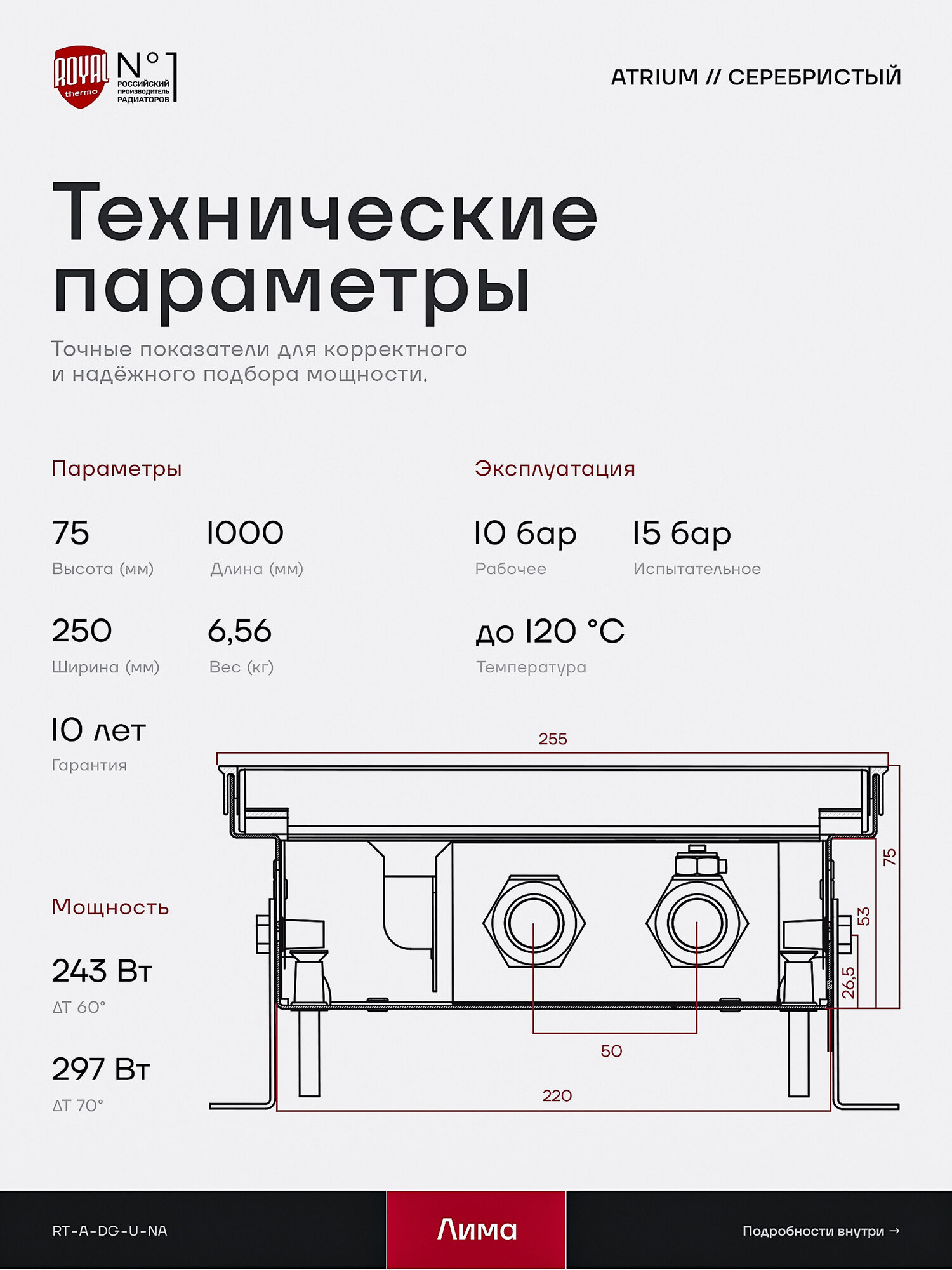Купить Внутрипольный конвектор Royal Thermo Atrium 75-250-1000 водяной, с решеткой цвет — алюминий с доставкой по всей России.