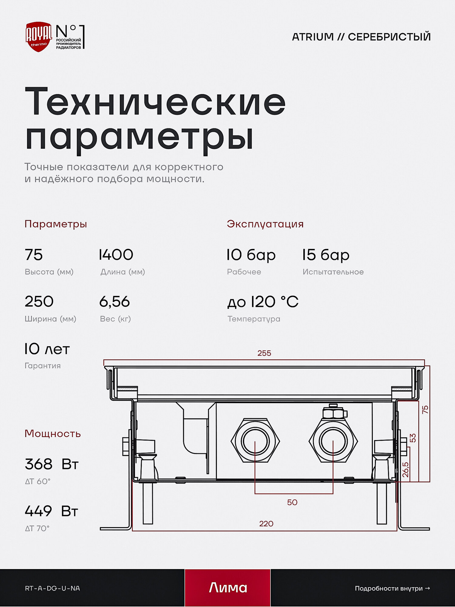 Купить Внутрипольный конвектор Royal Thermo Atrium 75-250-1400 водяной, с решеткой цвет — алюминий с доставкой по всей России.