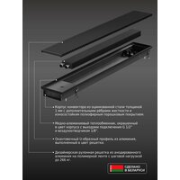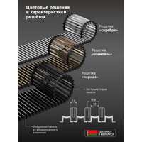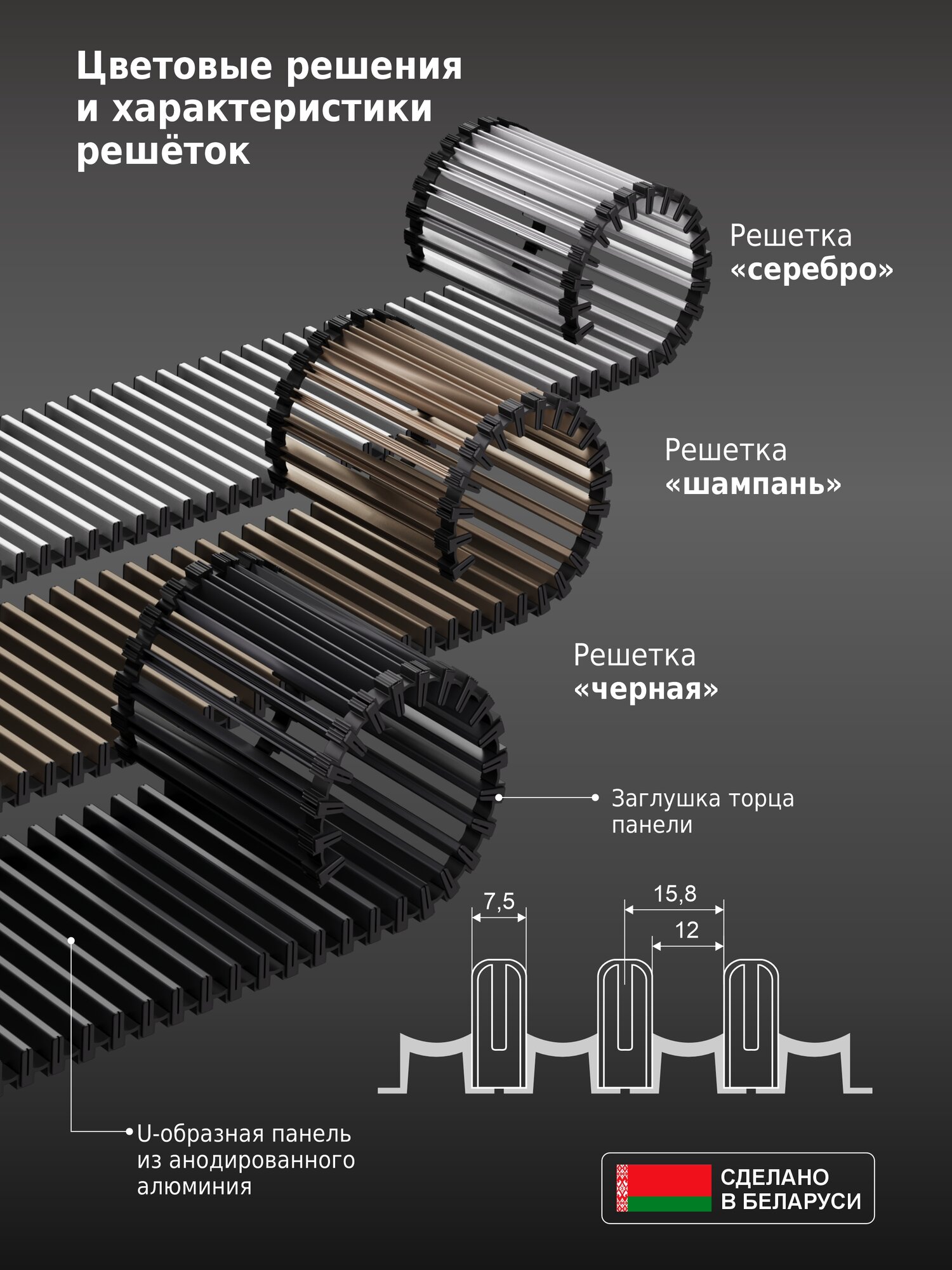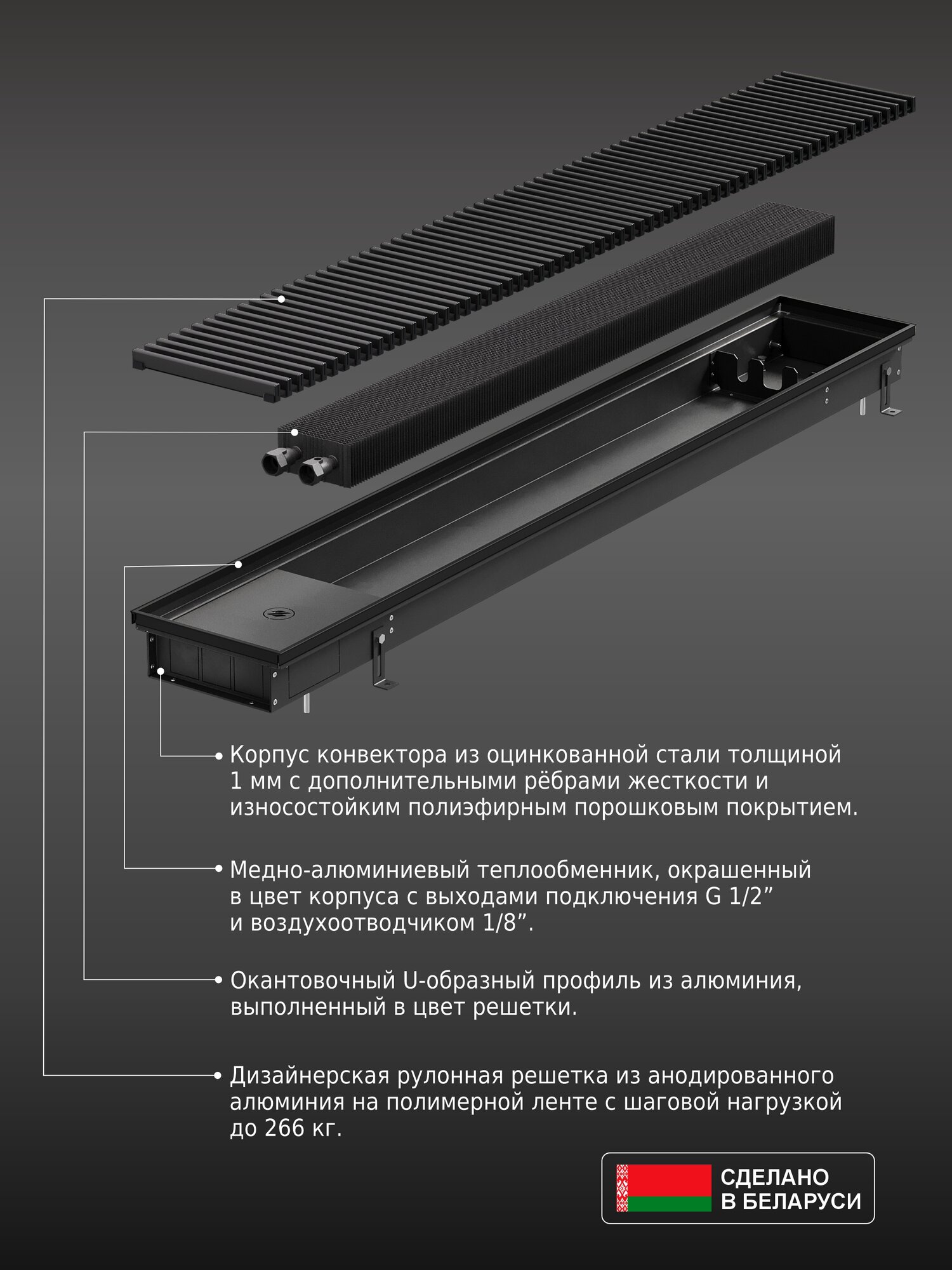 Конвектор Новатерм НТ-В состоит из установочного корпуса, изготовленного из стального оцинкованного листа толщиной 1 мм с кронштейнами для крепления корпуса ко дну внутрипольного канала и юстировочными винтами для установки конвектора по высоте, нагревательного элемента с воздухоотводчиком на обратном присоединительном патрубке и декоративной алюминиевой решетки для забора и выпуска воздуха.