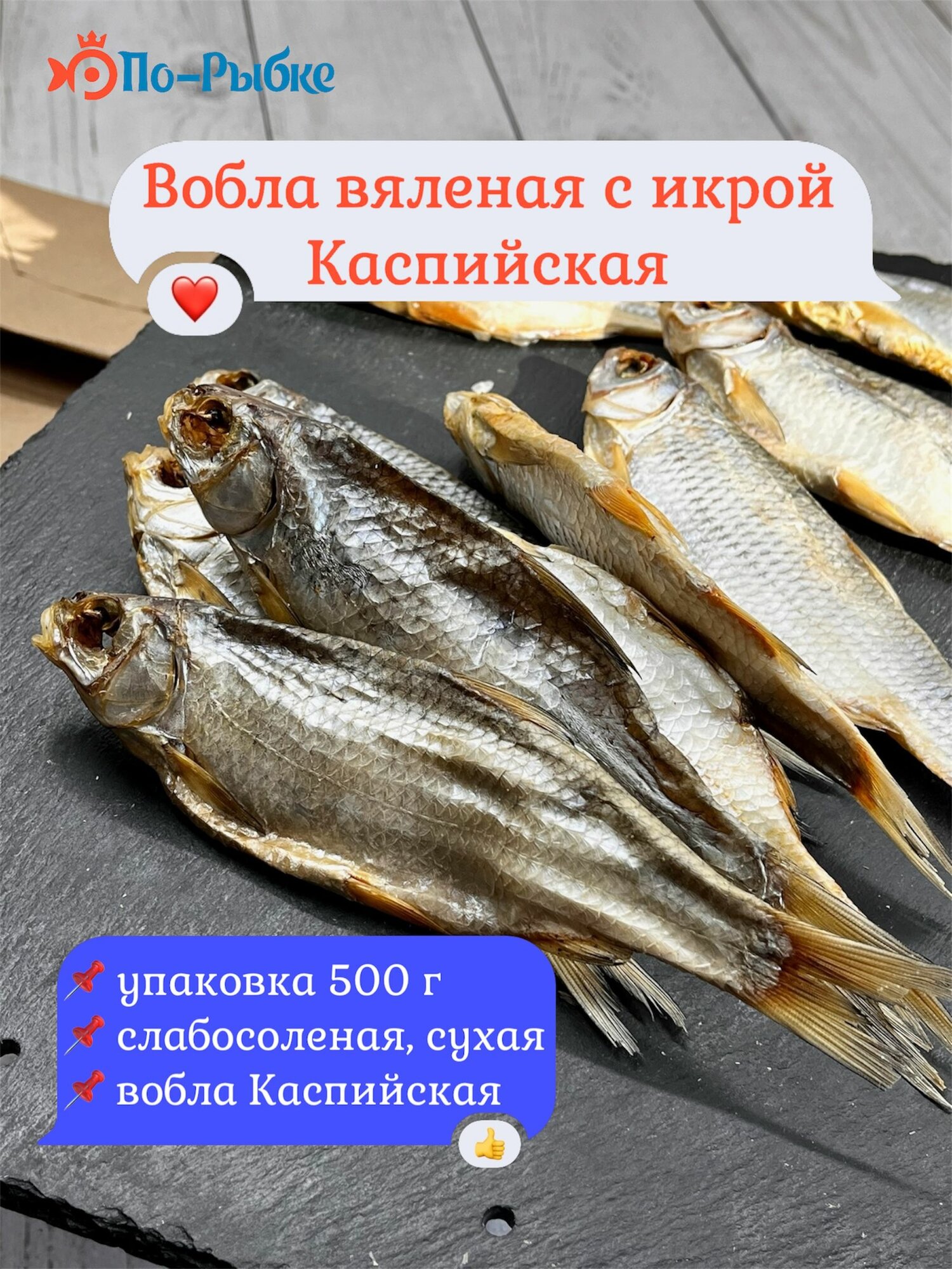 Вобла Каспийская икряная вяленая просушенная (сухая), слабосоленая с икрой. Вес одной рыбы 50-70г/шт. Размер 17-18 см / шт. Вяленая каспийская вобла — продукт, который изготавливают из рыбы, обитающей в Каспийском море. Вяление позволяет сохранить полезные вещества, одновременно придавая рыбе особый вкус. Икра воблы имеет мелкий размер и золотистый цвет. Она содержит витамины А, В и С, которые улучшают зрение, укрепляют костную ткань и стабилизируют работу сердечно-сосудистой системы. Мясо воблы очень нежное и содержит много белка и жирных кислот, которые необходимы для правильного функционирования организма. Кроме того, вобла содержит витамины группы В, приводящие в норму работу нервной системы и укрепляющие иммунитет. Попробуйте новинку и насладитесь неповторимым вкусом настоящей русской рыбы от нашего интернет-магазина «По-Рыбке»! Вобла, вобла астраханская с икрой, вобла астраханская вяленая с икрой, вобла вяленая, вобла астраханская, вобла с икрой, астраханская вобла с икрой вяленая, вобла вяленая с икрой, вобла сушеная, вобла астраханская вяленая