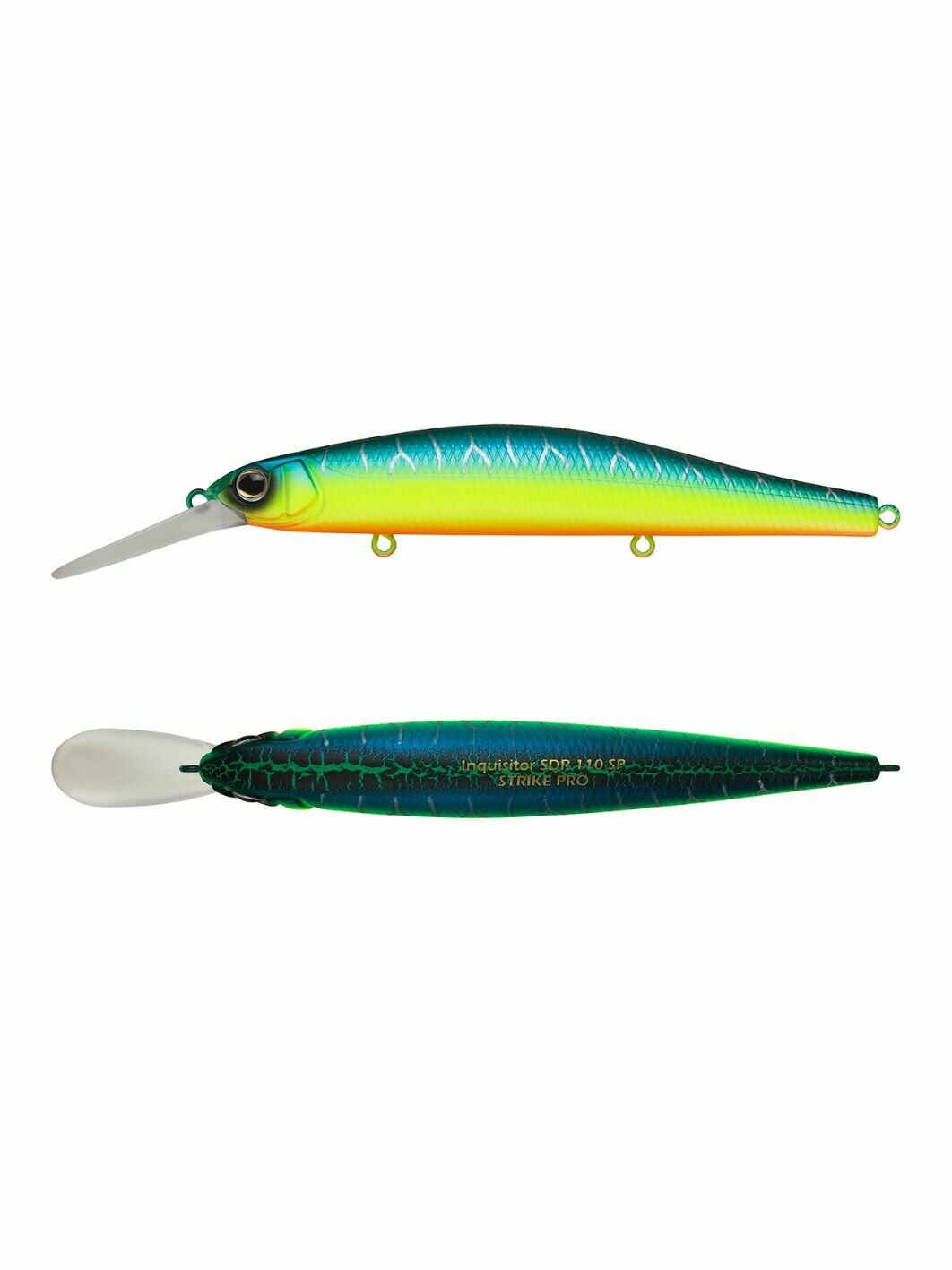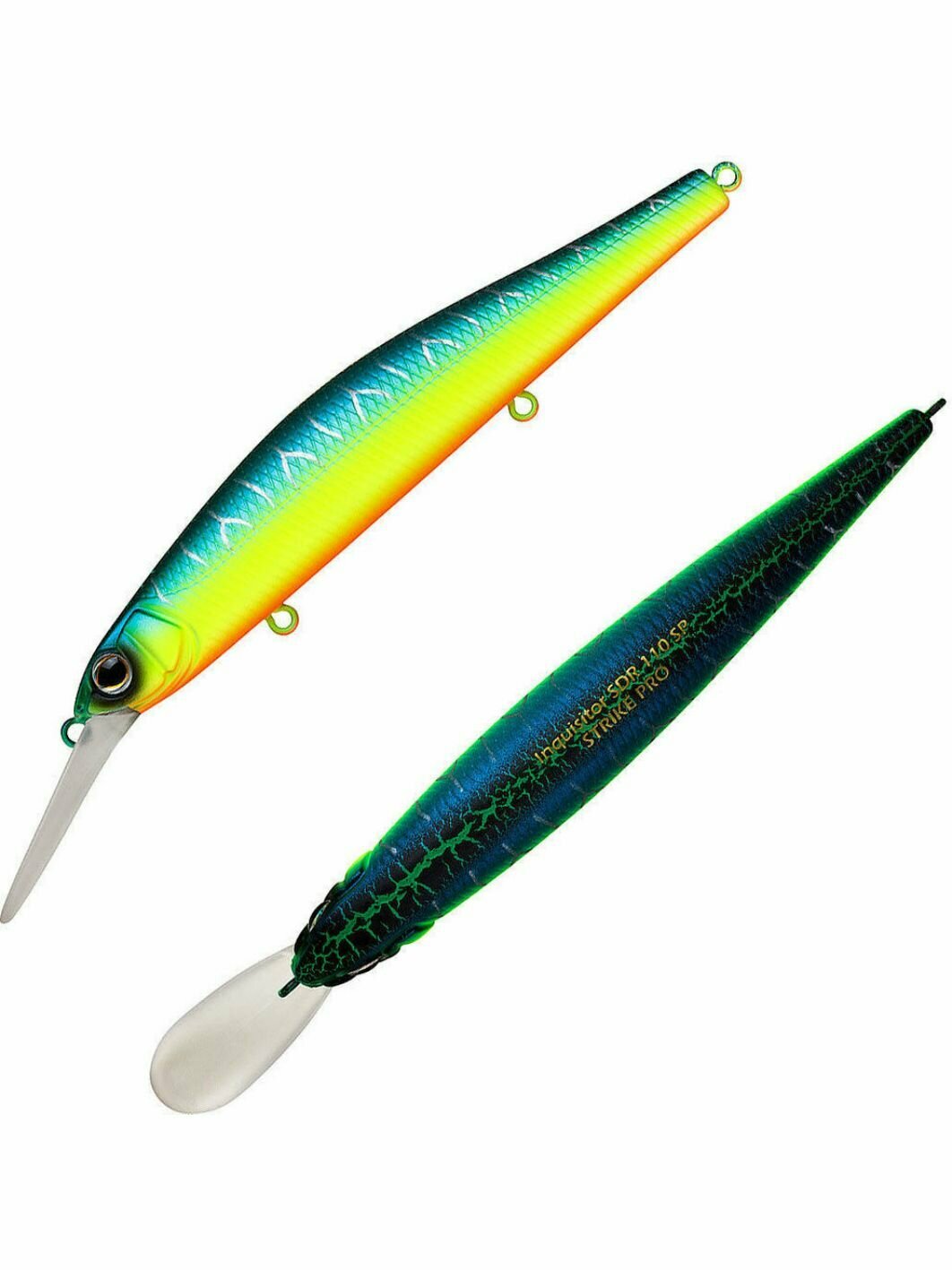 Обладает нейтральной плавучестью, рабочий горизонт немногим больше метра. По форме вытянутого и поджатого по бокам с горбиком тела относится к минноу. Особенностью приманки является магнитная система дальнего заброса. Мощности магнита достаточно для ограничения свободного хода шариков при горизонтальном положении. Но при забросе в положении хвостом вниз они смещаются в хвостовую часть и положительно влияют на аэродинамику. Небольшая лопасть воблера Strike Pro Inquisitor установлена под углом около 30°. Монтажная петля зафиксирована в носовой части с небольшим наклоном. Приманка легко управляется, хорошо контролируется при проводке, быстро занимает рабочий горизонт. На вооружении стоят пара тройников от Owner, подвешенных через заводные кольца. Благодаря качественной фурнитуре воблер отлично справляется с подсечкой крупного хищника, надежно держит энергичную рыбу до конца вываживания. Воблер Strike Pro Inquisitor (NEW) отличается активной и устойчивой игрой. Для анимации используется стандартный для минноу набор проводок: равномерная, stop and go, рывковая. Последняя дает наиболее привлекательную игру и приносит максимальные результаты. На рывках разной интенсивности совершает выраженные колебания корпусом, хорошо держит заданный горизонт. При равномерной проводке движения мягкие с отчетливыми осевыми доворотами. Во время потяжек с паузами демонстрирует привлекательные покачивания боками. Больше тридцати цветовых модификаций воблера Strike Pro Inquisitor позволяют подобрать необходимый вариант оформления для результативного лова в чистом или заиленном водоеме, для ночной ловли. В палитре большой выбор различных сочетаний природных оттенков, кислотных окрасок. Особого внимания заслуживают флуоресцентные и светящиеся варианты покрытий. Тщательная детализация позволяет различать выполненные рельефом жаберные крышки, нанесенную наклонными насечками чешую. Реалистично выглядят голографические глаза. ЛКП достаточно качественное и прочное, чтобы выдержать сезон без критических повреждений. Воблер Strike Pro Inquisitor хорошо отрабатывает любого хищника, но основную часть добычи составляют окунь, форель, жерех, некрупная щука.