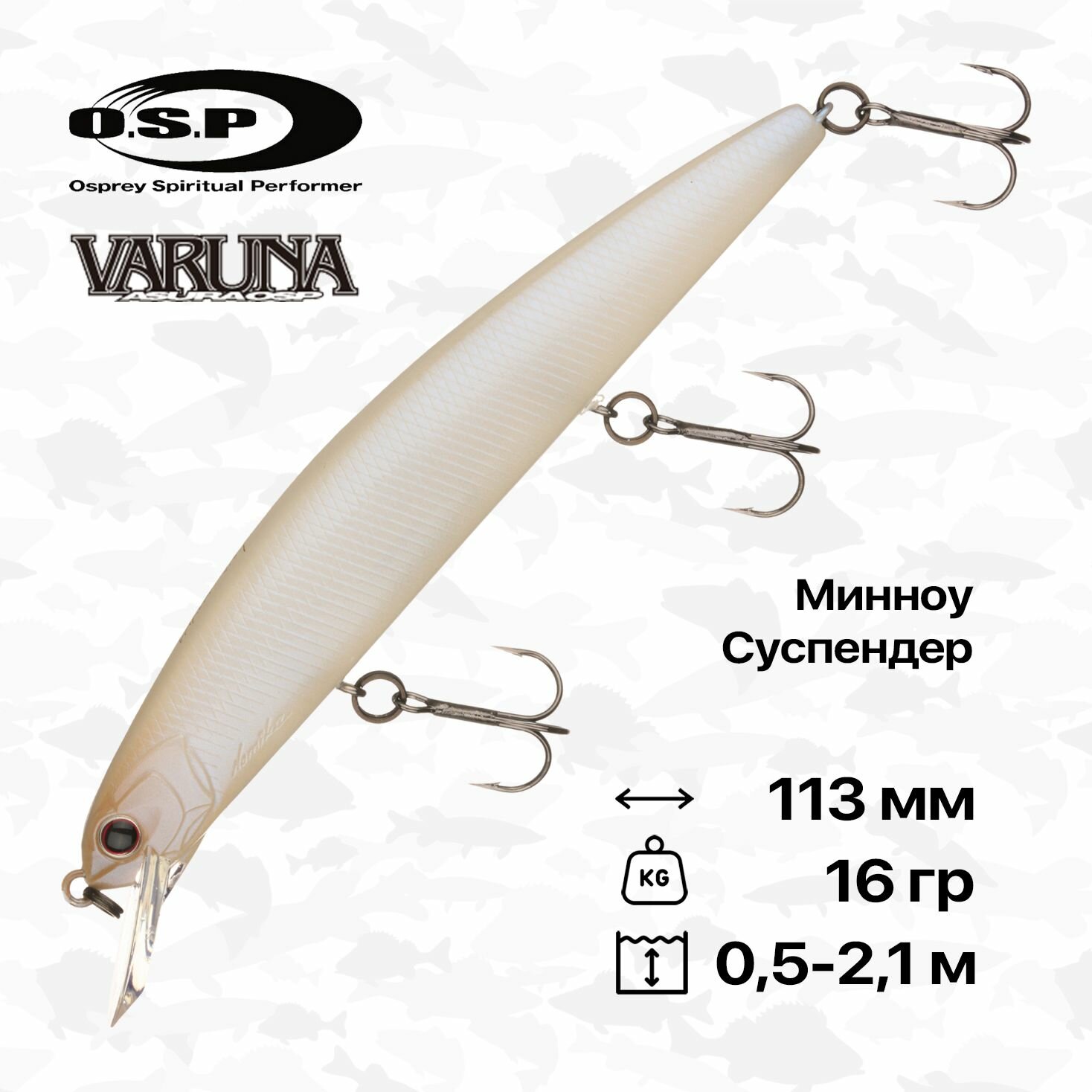 OSP Varuna долгожданное дополнение легендарных рывковых воблеров (джеркбейтов) Asura и Rudra. Воблер-минноу OSP Varuna длиной 113 мм «промежуточный размер» между достаточно крупной OSP Rudra (длинf 130 мм) и OSP Asura (длинf 95 мм). Недавняя новинка уже отлично зарекомендовала себя в наших широтах: Varuna успешно ловит щук, окуней, судаков, жереха. Система дальнего заброса и балансировки осуществляется при помощи стальных пластин и вольфрамовых шаров. Пластины закреплены неподвижно в головной и средней частях, обеспечивая максимально низкое расположение центра тяжести. Три вольфрамовых шара свободно передвигаются в специальной камере. При забросе они перемещаются в хвостовую часть, обеспечивая дальность и точность, а во время проводки возвращаются ближе к головной части для достижения необходимого баланса. Свободно размещенные шары генерируют привлекательные для рыбы шумы. Кроме того, во время рывковой проводки твичинга за счёт ударов о стенки камеры и друг о друга, разнообразят игру приманки. Так, OSP Varuna при рывковой проводке и на паузах характерно «вздрагивает» и «трепещет». Приманка имеет фирменный объёмно-плоский дизайн, при плоских боках воблера тело его достаточно объёмное. При такой конфигурации джеркбейт имеет меньшее лобовое сопротивление во время движения в воде, чем воблеры с овальным профилем в сечении. Приманка такого строения во время движения в воде генерирует более привлекательные блики, чем воблер с изогнутыми боками. Она сильнее возмущает водную среду, подавая сигнал для боковой линии хищника, плюс гораздо более заметна визуально с большего расстояния. Honey Comb Super HP Body запатентованная система внутреннего строения воблера. Благодаря оригинальной конструкции разработчикам удалось уменьшить толщину стенок корпуса на 40%. Это привело к сокращению массы пластикового корпуса, а общая масса приманки регулируется стальными пластинами и вольфрамовыми шарами-балансирами. Соответственно, игра воблера стала лёгкой, «воздушной», очень напоминающей «живую» игру бальсовых приманок. Прочность и стойкость к зубам хищника обеспечивается качественным пластиком и сотовой системой рёбер внутри.