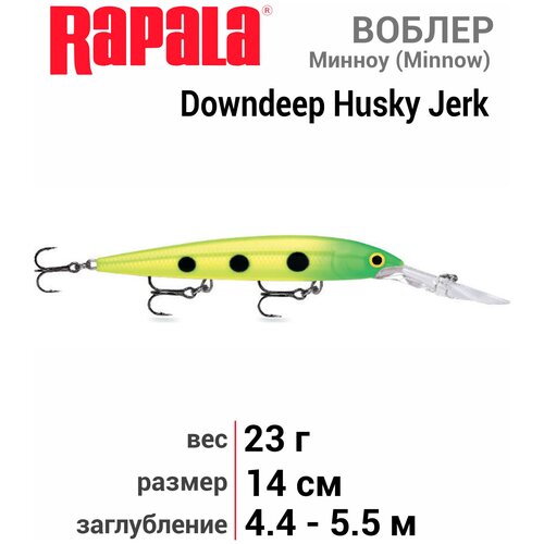 Воблер Rapala Down Deep Husky Jerk выполнен в виде прогонистой рыбки, что позволяет классифицировать его как минноу. Несмотря на то, что системой дальнего заброса приманка не оснащена, она обладает отличными аэродинамическими характеристиками. Модель подходит для спиннинговой рыбалки и троллинга. Длинная лопасть обеспечивает хорошую заглубляемость, что позволяет исследовать ямы и ловить рыбу на выходе из них. Высокая детализация делает воблер очень похожим на настоящую рыбешку. Даже с близкого расстояния хищник не сможет отличить его от натурального кормового объекта. Модель оснащена так называемой погремушкой. Несколько шариков, помещенные в шумовую камеру, встроенную в корпус, производят глухой звук, который привлекает внимание рыбы, находящейся неподалеку. По степени плавучести приманка относится к суспендерам. Во время остановки она не тонет и не вплывает, а остается на месте, демонстрируя хищнику упитанные бока, покрытые чешуей, выразительные глаза и очерченные жаберные крышки. Часто поклевки происходят в тот момент, когда после паузы воблер начинает двигаться. Для анимации используются разные техники. Спиннингист может применять равномерную проводку, твичинг или Stop & Go, действуя в зависимости от активности рыбы.
