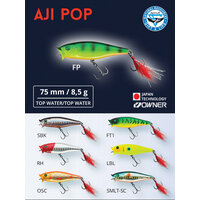 Поверхностные приманки серии Sprut Aji Pop относятся к типу ”поппер”. Воблеры данной серии оснащаются двумя острыми тройниками Owner. На хвостовом тройнике расположена мушка. Приманка оснащается шумовой камерой, издающей шум при проводке, привлекающий даже осторожных хищников. Воблеры оснащены системой дальнего заброса, благодаря чему обладают прекрасными полетными данными. Aji Pop имеет активную игру, имитирующую рыбьего малька. На потяжках издает характерный хлюпающий звук. Очень результативной для анимации этого поппера станет рывковая проводка на постоянной скорости подмотки. Воблеры данной серии могут ловить большинство видов хищных рыб.