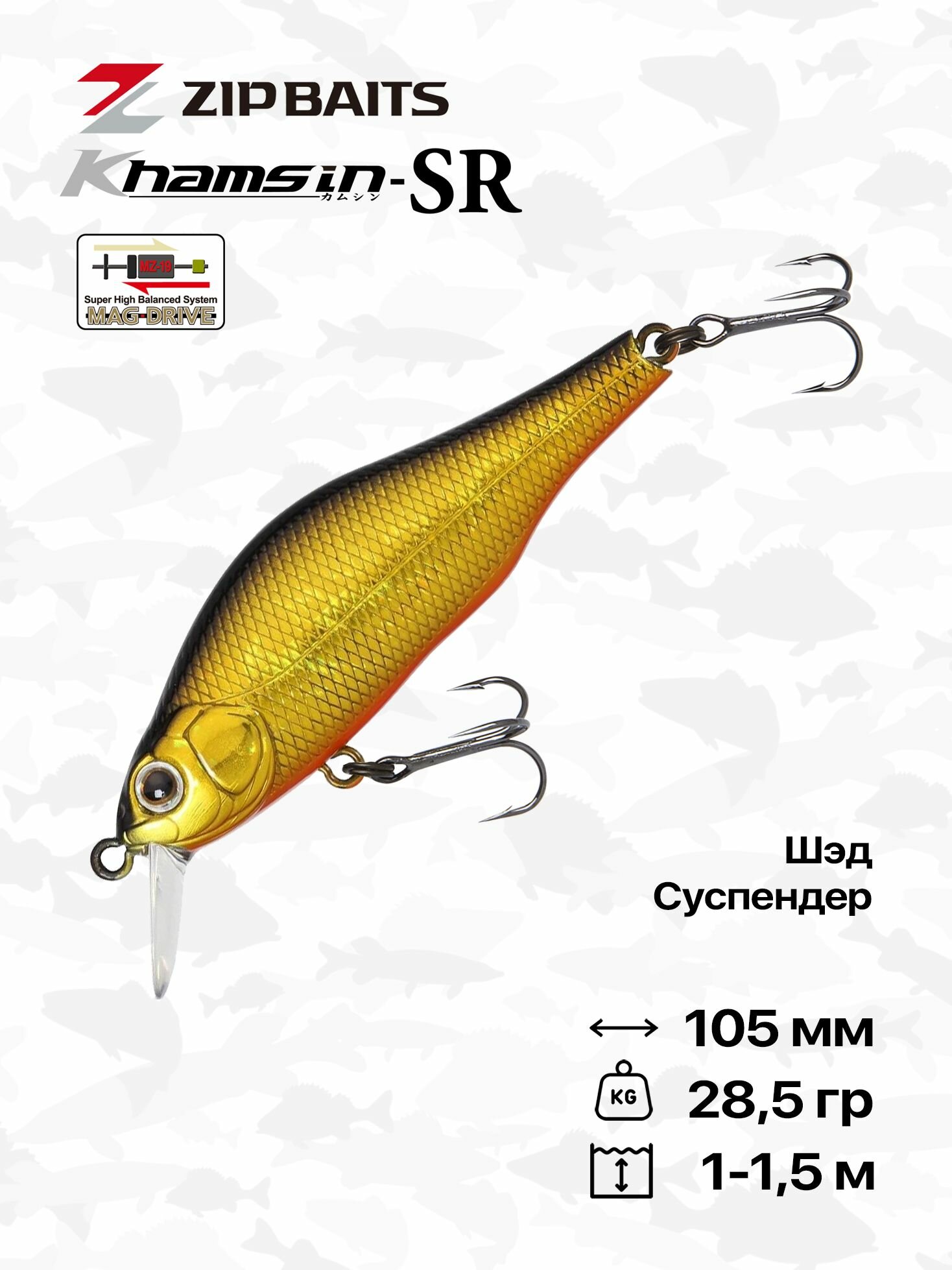 ZipBaits Khamsin SR – воблер-суспендер, самый крупный в размерной линейке Khamsin, длиной 105 мм. Отличные воблеры для ловли в заброс! Благодаря уплощенной с боков форме тела и запатентованной системе балансировки позволяют выполнять дальние и точные забросы даже против ветра. Один из лучших способов анимации - твиччинг, от хаотичного, с небольшой, в пределах 15 см амплитудой, до медленного с большими протяжками и паузами. Необходимая интенсивность зачастую зависит от степени активности хищника. Превосходно ловит щуку, окуня и судака.