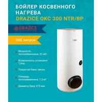 Drazice OKC 300 NTR/BP напольный водонагреватель косвенного нагрева воды объёмом 300 литров с эмалированным резервуаром при рабочем давлении до 1 Mpa. Водонагреватель оборудован одним мощным спиральным теплообменником, гильзами для датчиков контроля и управления, и также смотровым фланцевым люком. Для нагрева ГТВ применяется горячая вода с максимальной температурой 110 °C и давлением 1МПа. В смотровом люке можно смонтировать вспомогательный электронагревательный элемент серии R и SE. Патрубок 6/4" над нижним теплообменником предназначен для монтажа вспомогательного электронагревательного элемента серии TJ для дополнительного нагрева ГТВ. Такой дополнительный нагрев применяется при подключении водонагревателя к системе на солнечных батареях. Изоляцией служит слой твёрдой полиуретановой пены толщиной 50 мм.