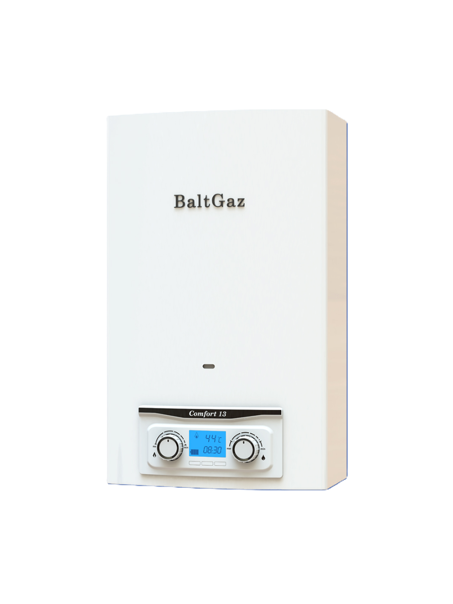 Газовая колонка BaltGaz Comfort 13 предназначена для нагрева 13 литров воды в минуту. Изготовлена с учетом всех особенностей водоснабжения в России и странах СНГ, поэтому стабильно работает в условиях жесткой воды. Перед поступлением в продажу оборудование и его запасные части проходят испытания на прочность и безопасность. Водонагреватель BaltGaz Comfort 13 имеет следующие достоинства: Надёжный медный теплообменник 99,9%Сu. Устойчивая работа при низком давлении воды; Газовая горелка нового поколения; Включение при минимальном давлении воды; Яркий дисплей с индикацией ошибок и часами, текущей температуры воды; 7 систем безопасности; Возможность подключения к сети 220V.