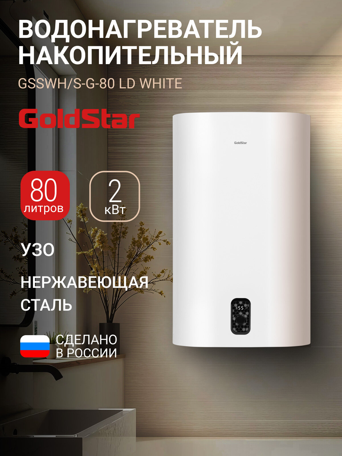 Купить Водонагреватель накопительный GoldStar GSSWH/S-G-80 LD, 80 л, 2000 Вт, 3 режима, антифрост, магниевый анод, LED-дисплей с доставкой по всей России.