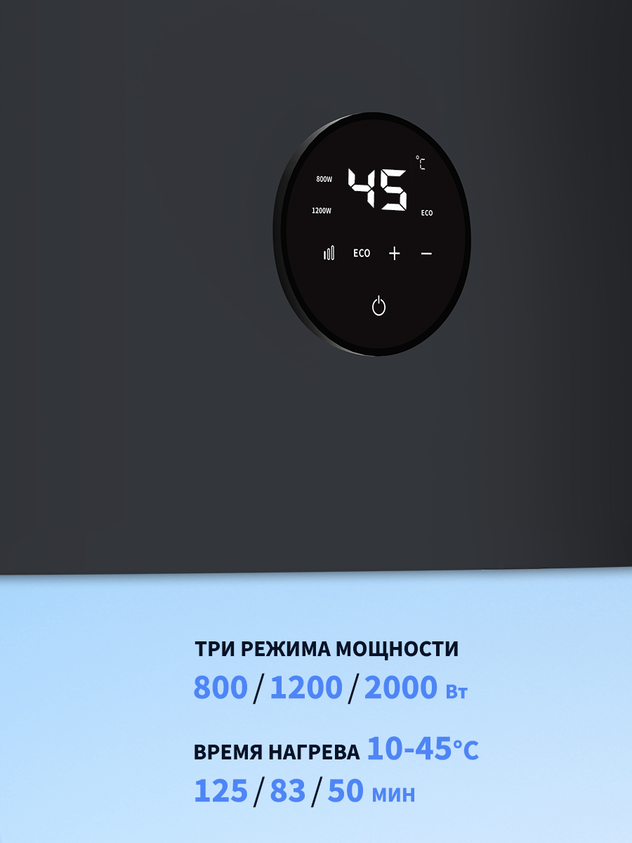 - 3 режима мощности (800/1200/2000 Вт) подстраивает нагрев под необходимый расход, экономя электроэнергию.