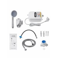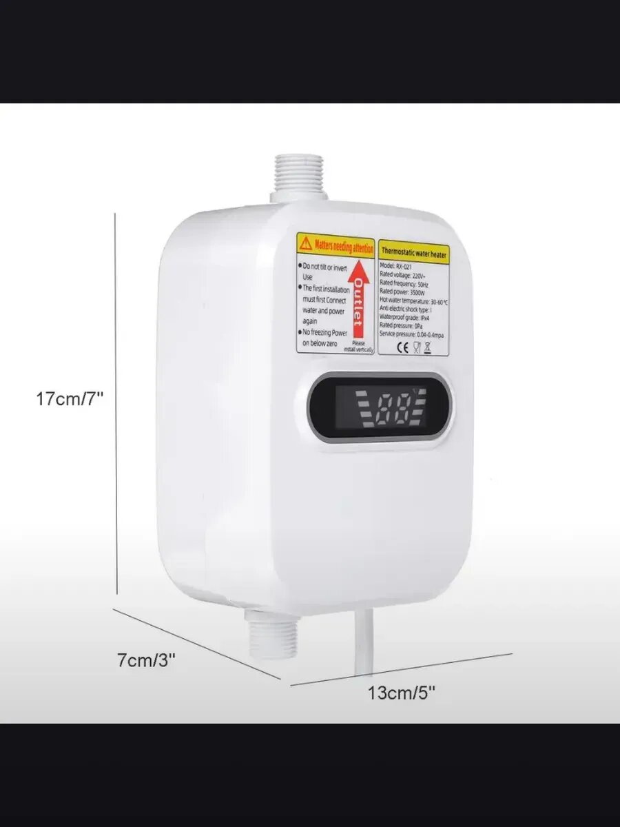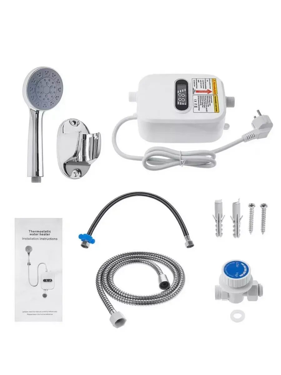 Электрический небольшой водонагреватель с душевой лейкой мощностью 3500 Вт создаст дополнительный комфорт в любом частном доме и квартире, послужит идеальным вариантом для дачи и загородного коттеджа. При отключении или отсутствии горячего водоснабжения полезное бытовое устройство позволит принять теплый душ в дачных условиях как в летний период, так и зимой. Индикатор, расположенный на фронтальной панели, помогает выбрать необходимую температуру подогрева, что очень удобно во время принятия водных процедур. Нужный режим в диапазоне от 30 до 60 градусов Цельсия устанавливается с помощью поворотного терморегулятора. Преимущество проточной системы перед моделями с накопительным принципом работы заключается в том, что холодная вода в нем нагревается мгновенно, проходя через встроенный ТЭН. Напорный прибор способен снабжать сразу несколько точек водозабора, для чего требуется соответствующее давление в водоснабжающей системе. Благодаря компактному размеру водогрей, соединенный с душем, отлично помещается даже в маленькой ванной комнате. Электронагреватель легко монтируется на стену в вертикальном положении, и с его креплением справится даже новичок. Корпус трубчатого изделия водонепроницаемый, надежно защищен от перегрева и имеет двойную гидроизоляцию, поэтому его можно использовать даже там, где живут дети или пожилые люди. Безрезервуарный бойлер начинает работать в течение 3-х секунд, а за одну минуту нагревает целых 8 литров! Покупайте эргономичный водяной нагреватель и делайте свою жизнь более комфортной и приятной!