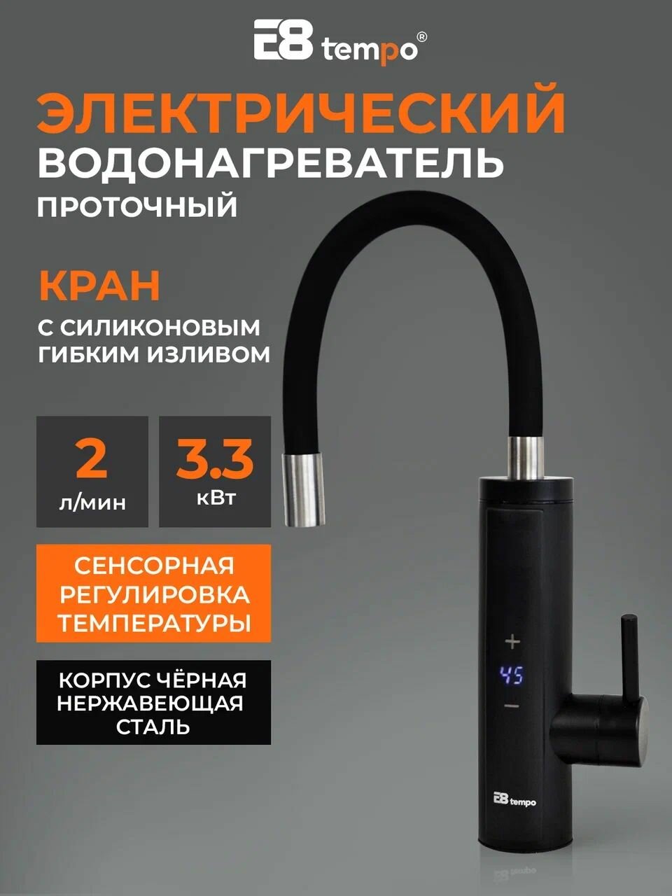 Водонагреватель регулируемый проточный электрический E8 tempo (кран с чёрным силиконовым гибким изливом) E8-S6-10D, мощность 3,3 кВт: сравнение цен, характеристики, фото, актуальное наличие и цены.