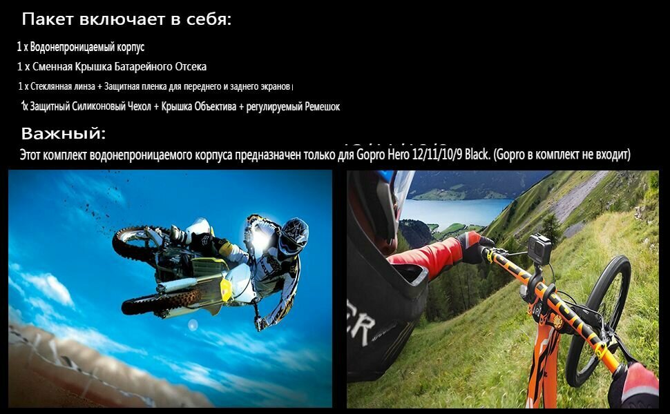 Все крепления в этом комплекте, разработанные специально для Gopro Hero 12 / Hero 11 / Hero 10 / Hero 9 Black, совместимы с Gopro Hero12, Hero11, Hero10 и Hero9. Он состоит из водонепроницаемого корпуса, силиконового чехла, защитной пленки для стеклянного экрана, крышки батарейного отсека (боковая дверца).