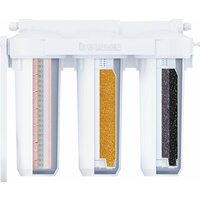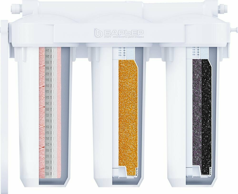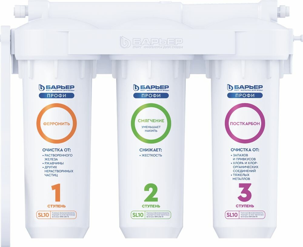 Классический 3-х ступенчатый фильтр с картриджами стандарта SlimLine 10’’ для доочистки железистой и жёсткой воды. Обеспечивает одновременное обезжелезивание и умягчение воды. Эффективно удаляет растворённое (двухвалентное) и коллоидное (трёхвалентное) железо. Производительность - 2 л/мин. Ресурс 10 000 литров. В комплект входят картриджи: 1."барьер профи Ферронить" навитой материал с прочными ионообменными связями для удаления растворённого и коллоидного железа при высоких концентрациях – до 3 ПДК (до 0,9 мг/л). 2."барьер профи Смягчение" - снижение карбонатной жесткости, из-за которой образуется накипь в чайнике. Ресурс по умягчению воды до полугода. Но картридж может быть подвергнут регенерации в домашних условиях с помощью простой поваренной НЕ йодированной соли не чаще 8 раз. 3."барьер профи ПостКарбон" удаляет остаточный хлор и его побочные продукты, неприятные запахи и привкусы, кондиционирует воду. Один проточный фильтр барьер за год помогает уберечь планету от полтонны пластика.