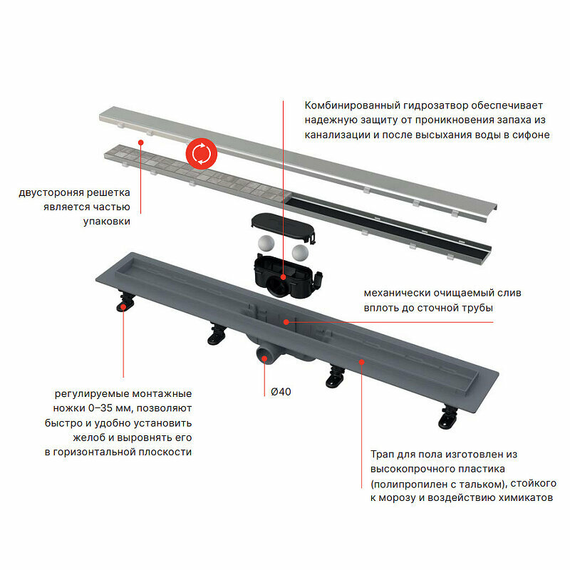 | Состав | лоток, трап, ножки, решетка, рамка, декоративная накладка, механический затвор, набор для установки, крюк для демонтажа, встраиваемый сифон, гидрозатвор, сифон, прокладка, сухой затвор |