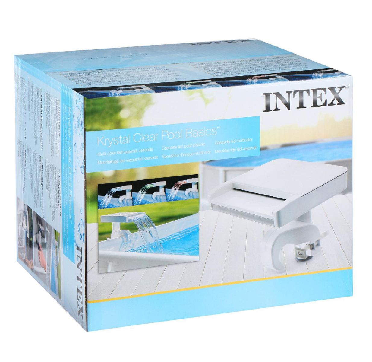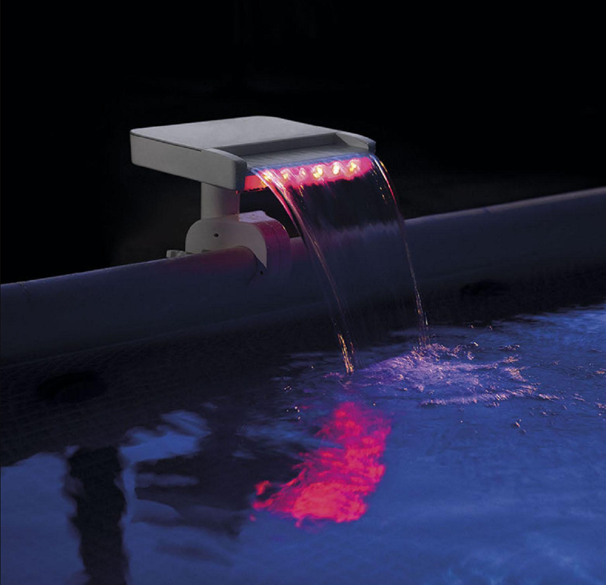 Водопад с подсветкой Multi-Color Led Waterfall Sprayer Intex 28090 Добавьте немного спокойствия в бассейн с помощью каскадного водопада Intex 28090. В вечернее время светодиодный фонтан подсвечивается синим, зеленым и красным цветами. Водопад легко подключается к насосному шлангу. Характеристики: Требуемая мощность насоса: 4,612,2 л/ч Встроенный гидрогенератор Вес кг: 4,6 кг. Фонтан для бассейна с Led подсветкой не подходит для бассейнов серии Intex Easy Set, Oval и Graphite Gray Panel. Разбрызгиватель для бассейна подходит: для всех круглых и прямоугольных металлических каркасных бассейнов Intex серии Prism Frame и Ultra Frame. В комплекте имеется все необходимое для подключения к бассейну.