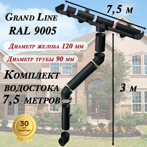 Купить Водосточная система Grand Line 7,5 м ( 120мм/90мм ) черный водосток для крыши пластиковый Гранд Лайн ( RAL 9005 черный янтарь ) комплект ПВХ с доставкой по всей России.