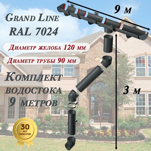 Купить Водосточная система Grand Line 9 м ( 120мм/90мм ) графит RAL 7024 водосток для крыши пластиковый Гранд Лайн ( серый ) комплект ПВХ с доставкой по всей России.