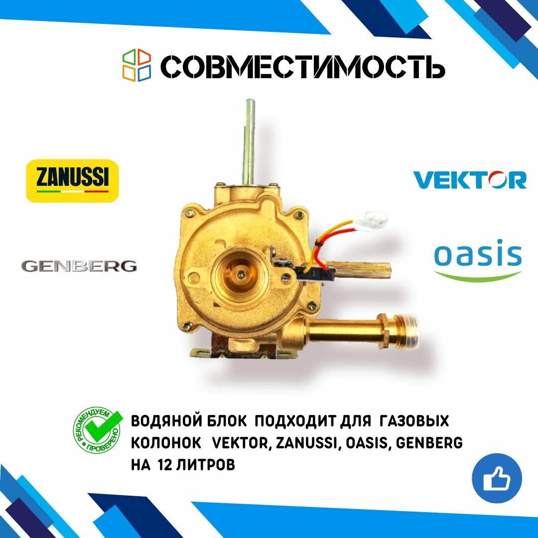 Водяная часть (блок, узел) для газовых колонок VEKTOR, OASIS, ZANUSSI, GENBERG на 12 литров (диаметр 73 мм.) с микровыключателем: сравнение цен, характеристики, фото, актуальное наличие и цены.