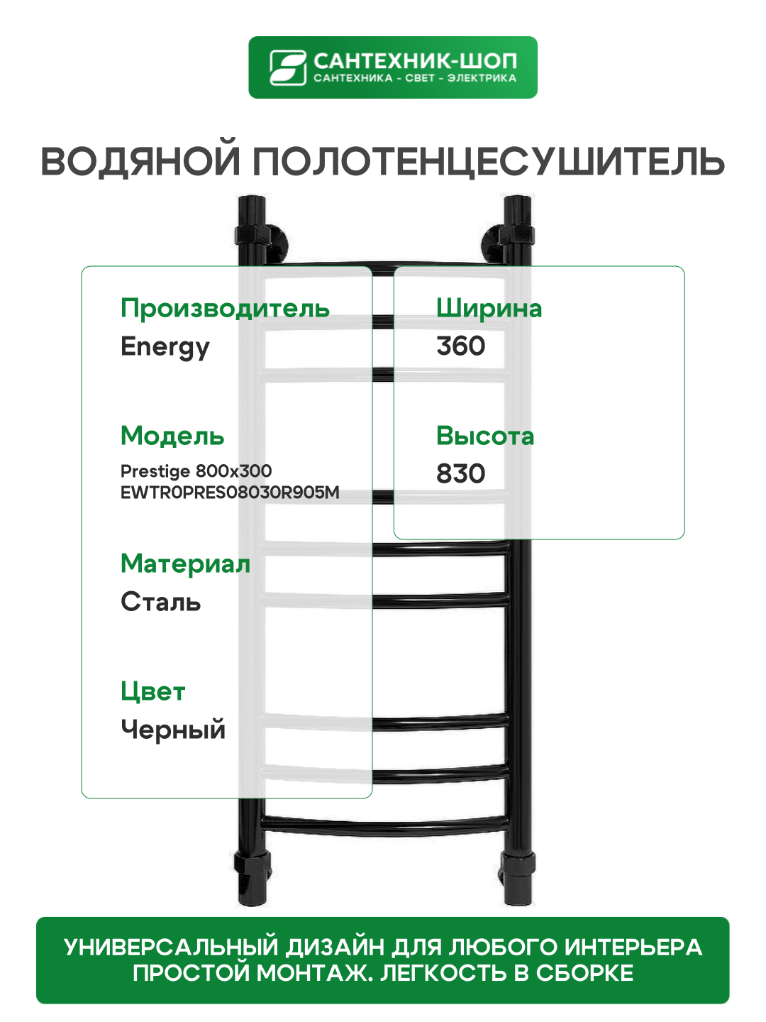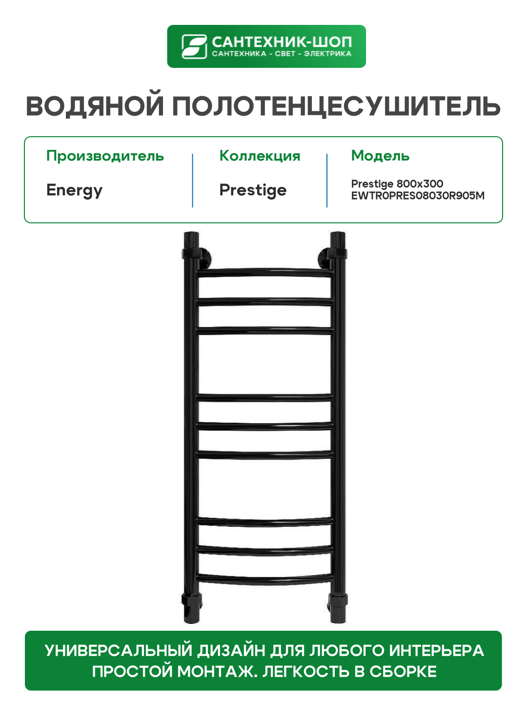 Купить Водяной полотенцесушитель Energy Prestige 800×300 EWTR0PRES08030R905M Черный матовый нержавеющая сталь с доставкой по всей России. Водяной полотенцесушитель Energy Prestige 800×300 EWTR0PRES08030R905M Черный матовый нержавеющая сталь: сравнение цен, характеристики, фото, актуальное наличие и цены.