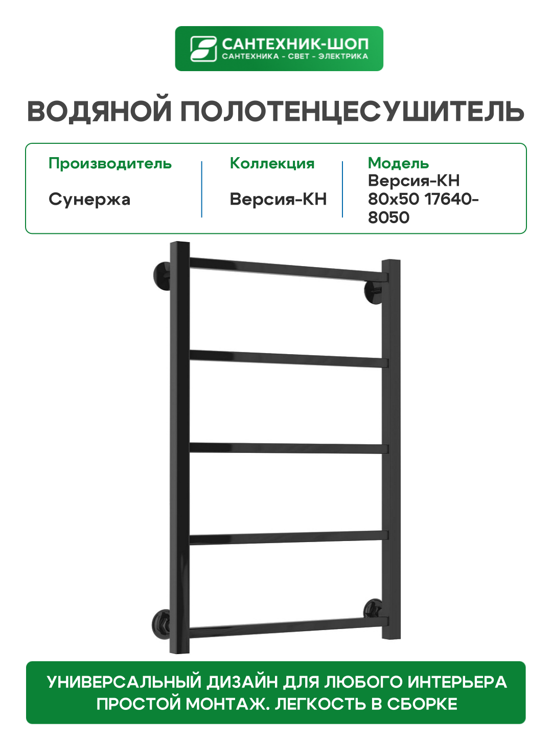 Водяной полотенцесушитель Сунержа Версия-КН 80×50 17640-8050 цвет Чёрный: сравнение цен, характеристики, фото, актуальное наличие и цены.