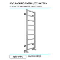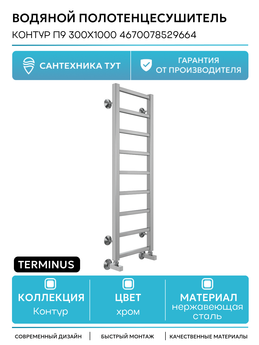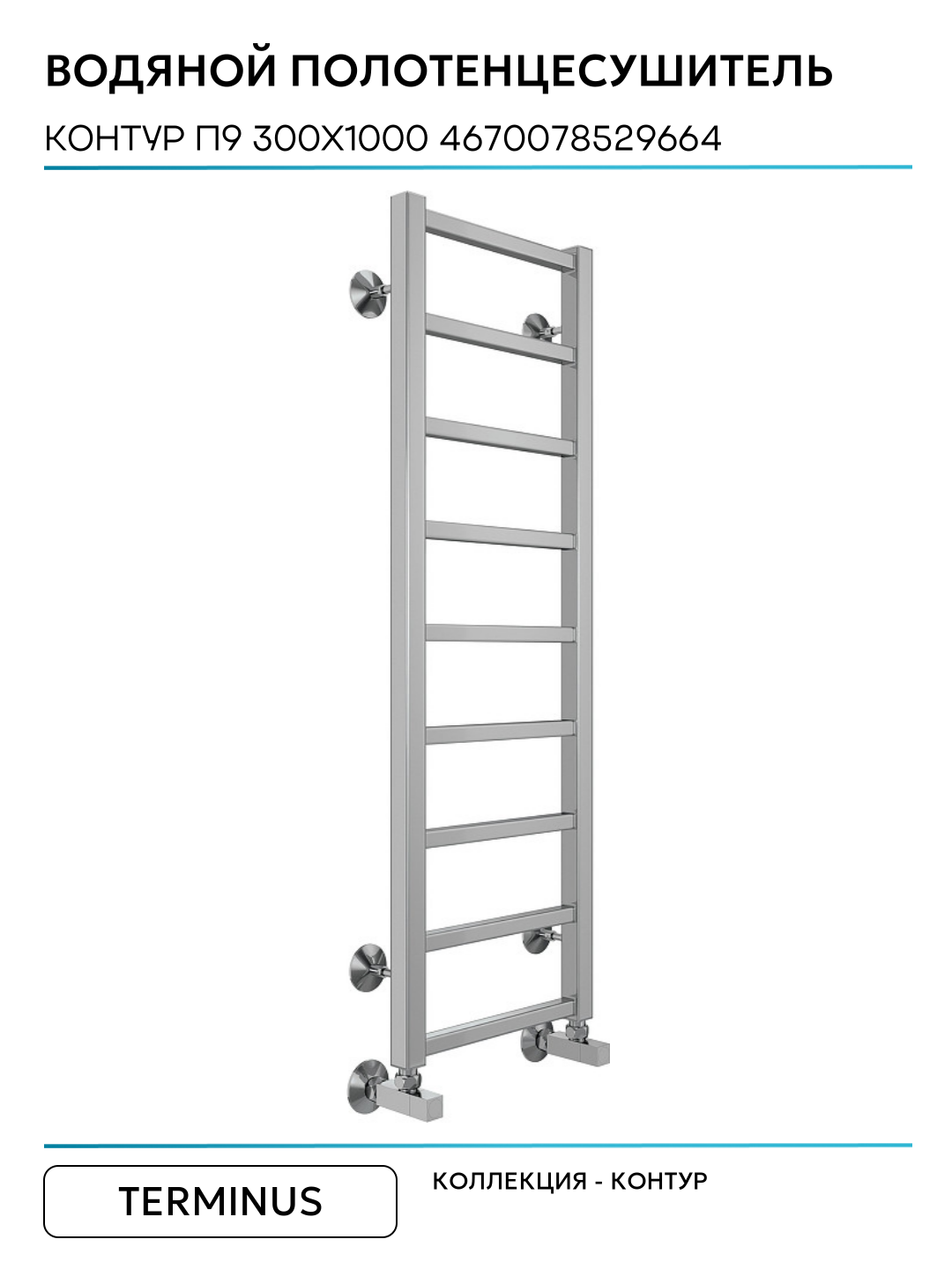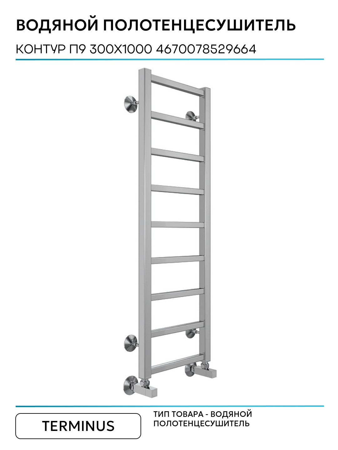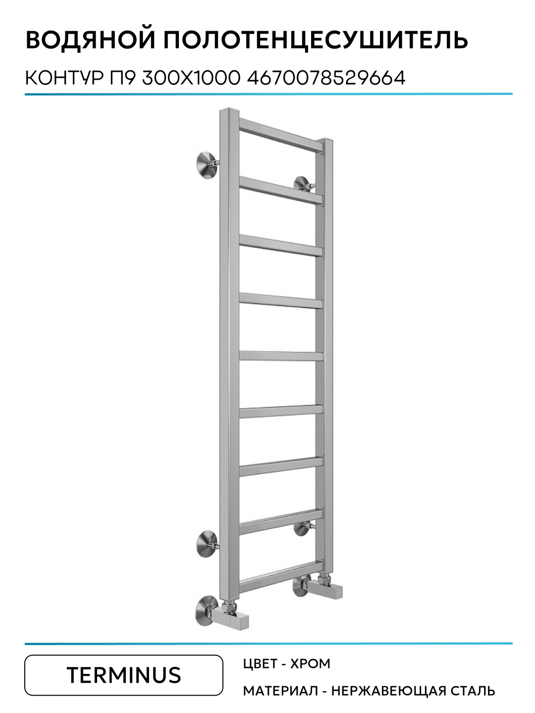 Водяной полотенцесушитель Terminus Контур П9 300х1000 4670078529664 Хром, нижнее подключение, G 1/2″ ВР, с угловым соединением: сравнение цен, характеристики, фото, актуальное наличие и цены.