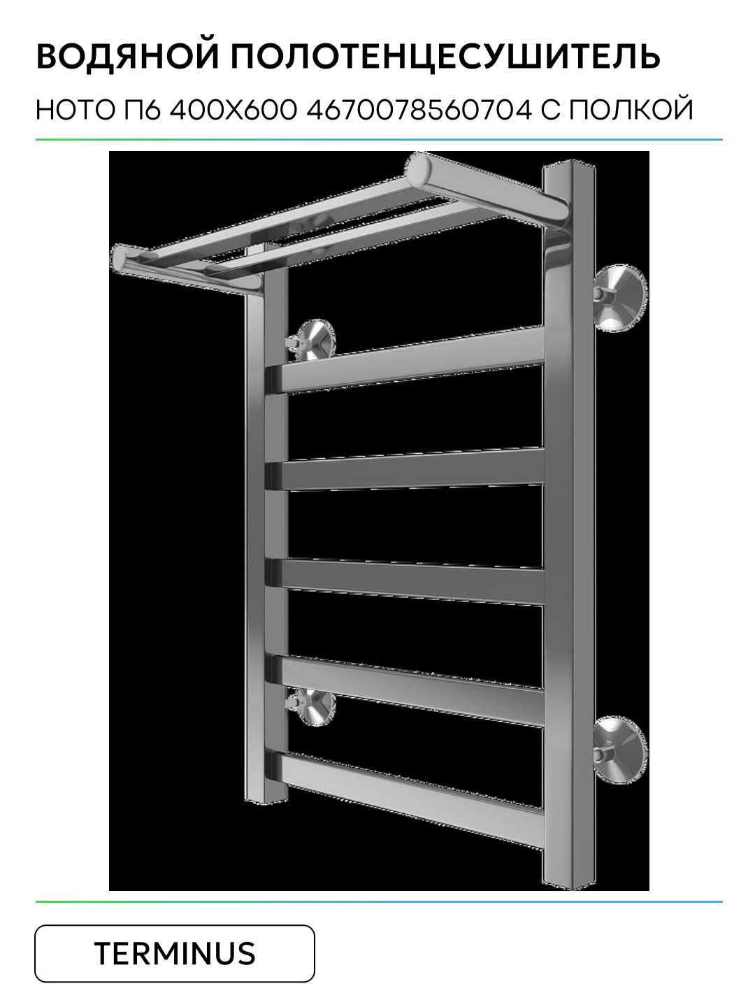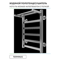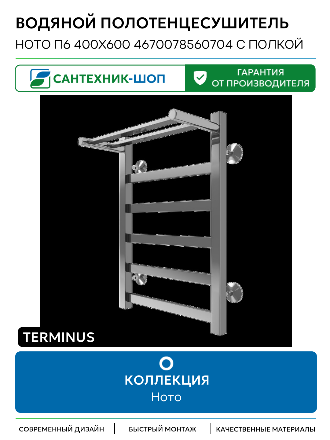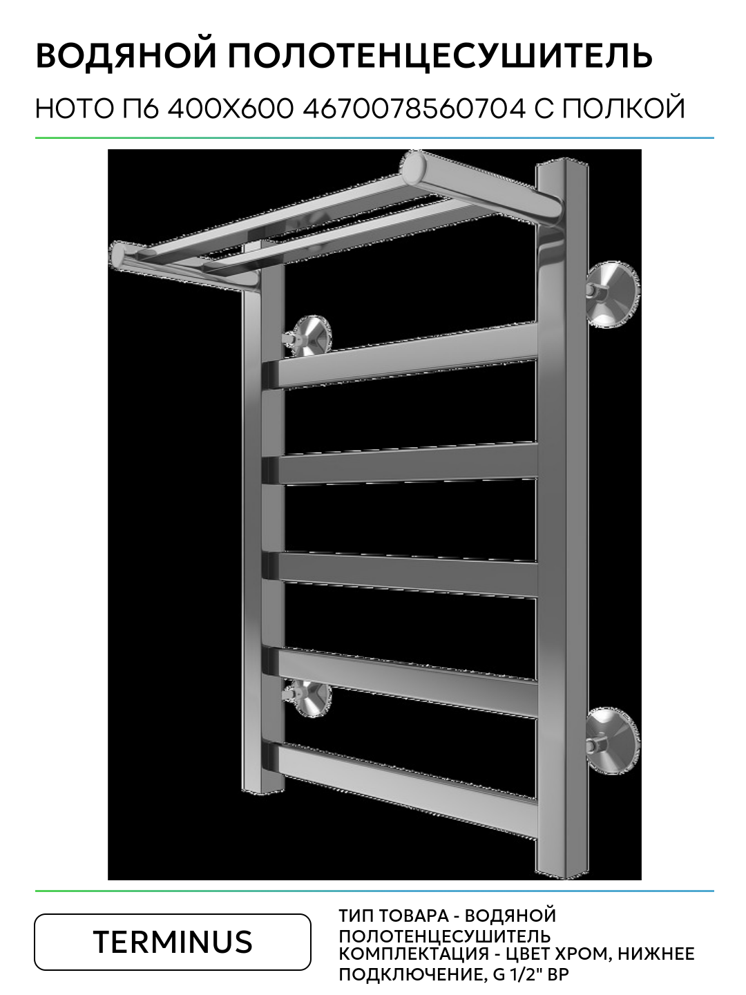 Водяной полотенцесушитель Terminus Ното П6 400х600 4670078560704 с полкой цвет Хром, нижнее подключение, G 1/2″ ВР: сравнение цен, характеристики, фото, актуальное наличие и цены.
