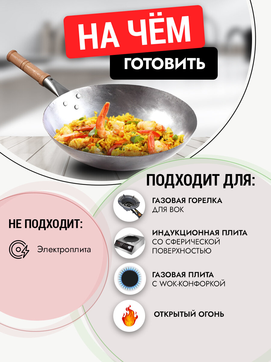 -ручная обработка вока по всей поверхности; -имеет круглое дно; -подходит для индукционных плит со сферическим основанием и может использоваться с открытым огнем; -прочное и надёжное крепление деревянной ручки на трёх клёпках; -подходит для приготовления различных блюд: от жарки мяса и овощей до приготовления вкусных азиатских блюд. Перед использованием сковороды необходимо провести предварительную подготовку, включающую прокалку и нанесение масляного слоя. Обязательно ознакомьтесь с инструкцией!