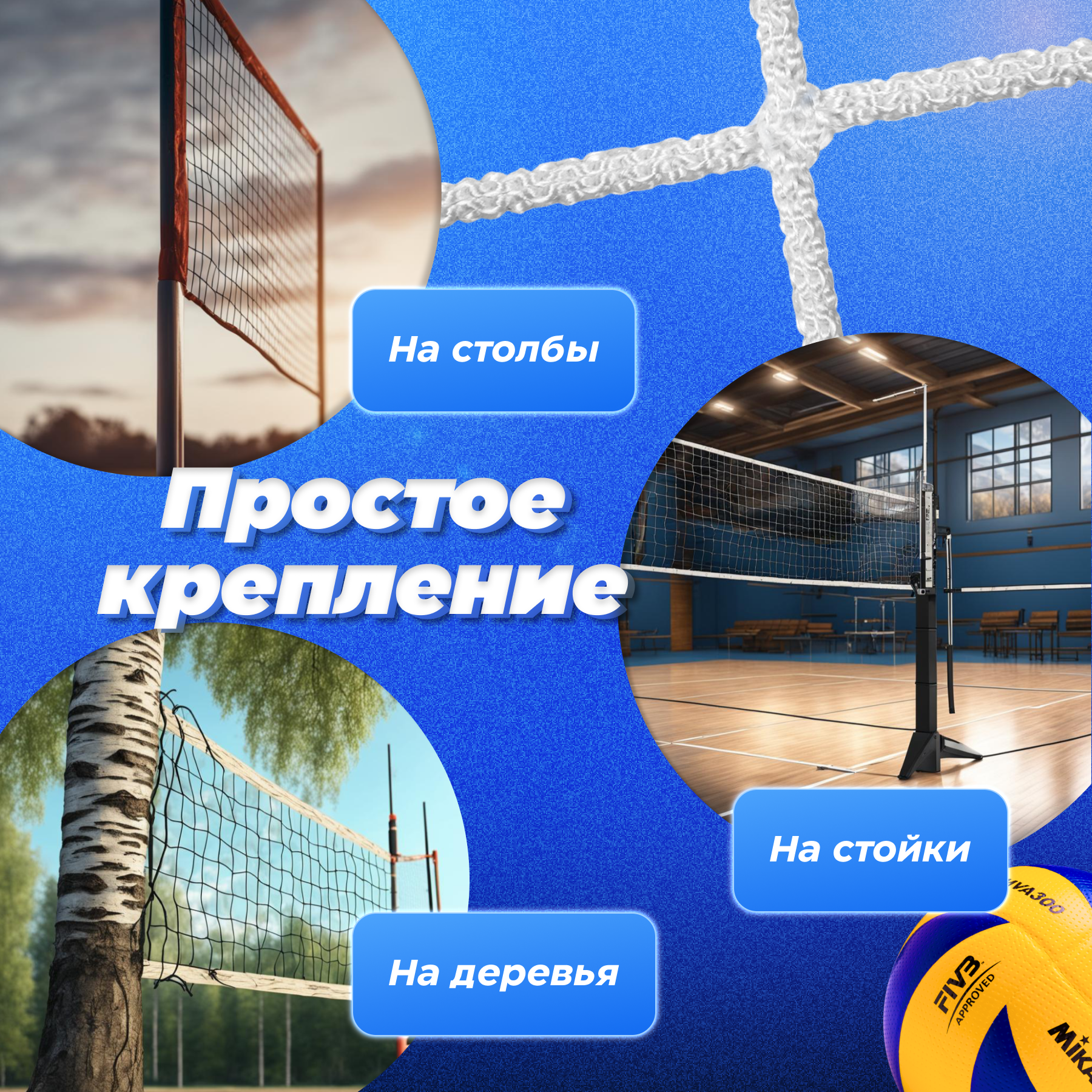В комплект поставки входят сама сетка для волейбола и четыре подвязки по углам.