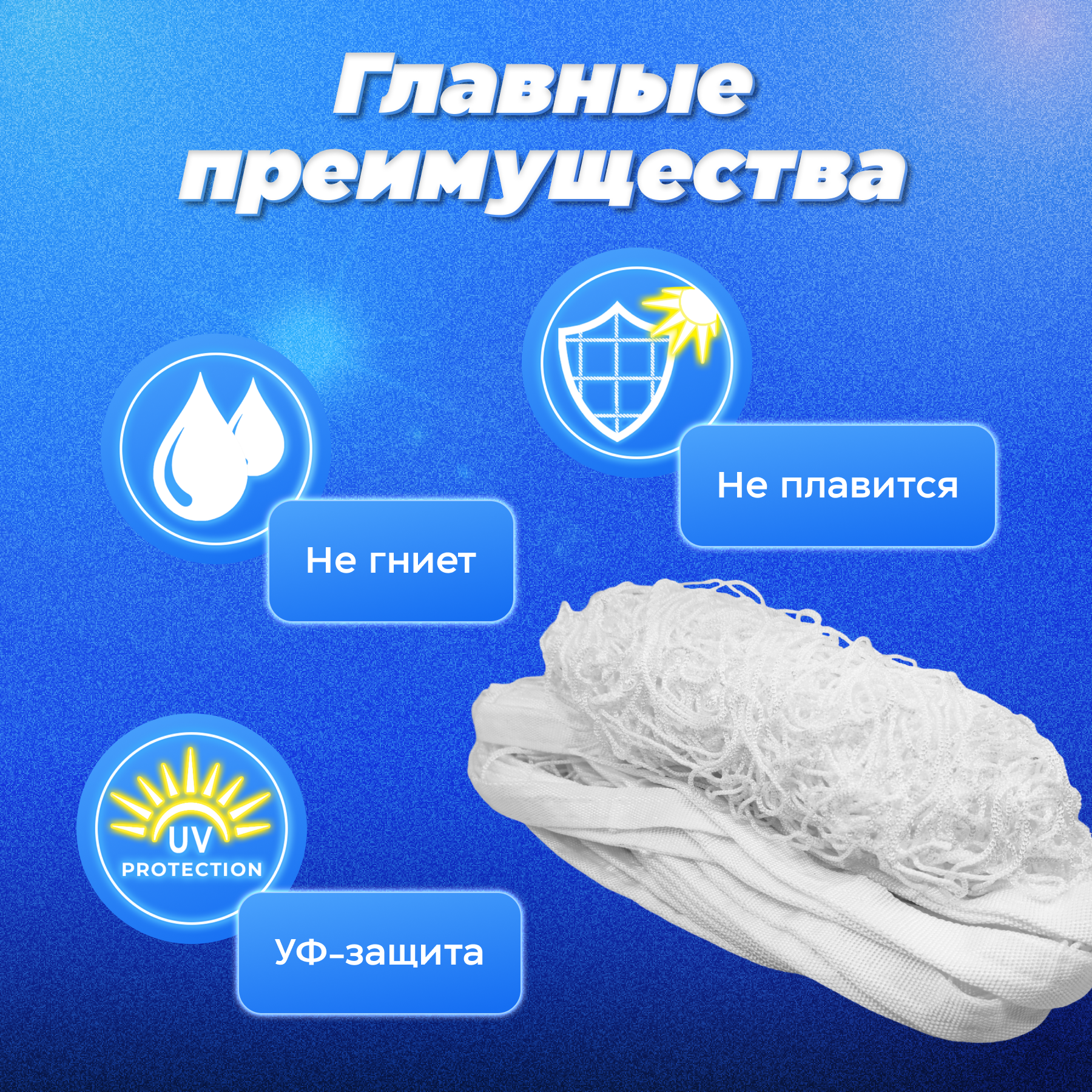 Сетка изготовлена из смеси капрона и полипропилена, что обеспечивает ей устойчивость к солнечному излучению и влаге. Благодаря этому сетка не тлеет и не плавится на солнце, не гниет и не деформируется после намокания.