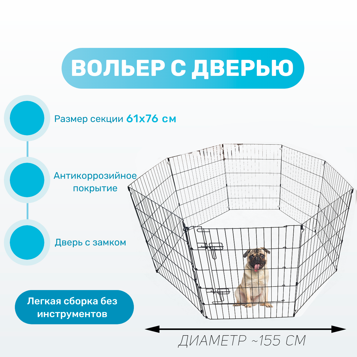 Вольер «Чистый котик» - уютный уголок для Вашего питомца. Он не только обеспечит животное личным пространством, помогая приучиться к месту еды и туалета, но и защитит дом от его нежелательных похождений и игр. Изделие состоит из 8 одинаковых по размеру секций (7 секций + секция с дверью), которые можно легко собирать-разбирать не используя дополнительных инструментов, а также комбинировать в различных сочетаниях под нужный размер и форму. Вольер сделан из прочного металла, а дверь оборудована простым, но надежным замком – Вы можете не беспокоиться, что Ваш питомец сможет сам выбраться. Материал: металл. Размер секции: 61x76 см. Размер ячейки: 3,5х14,5 см. Размер двери: 47х59 см. Размер входа: 45х61 см. Высота порога: 15,5 см. Цвет: черный. Количество секций: 8 шт.