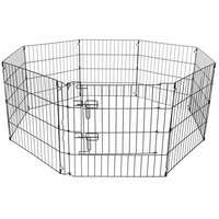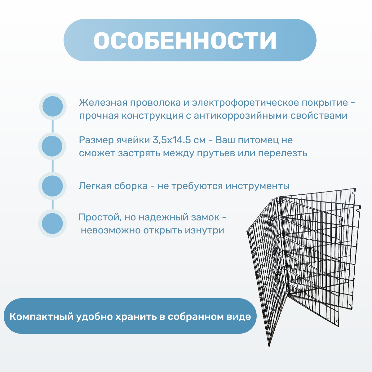 Вольер «Чистый котик» - уютный уголок для Вашего питомца. Он не только обеспечит животное личным пространством, помогая приучиться к месту еды и туалета, но и защитит дом от его нежелательных похождений и игр. Изделие состоит из 8 одинаковых по размеру секций (7 секций + секция с дверью), которые можно легко собирать-разбирать не используя дополнительных инструментов, а также комбинировать в различных сочетаниях под нужный размер и форму. Вольер сделан из прочного металла, а дверь оборудована простым, но надежным замком – Вы можете не беспокоиться, что Ваш питомец сможет сам выбраться. Материал: металл. Размер секции: 61x91 см. Размер ячейки: 3,5х14,5 см. Размер двери: 47х74,5 см. Размер входа: 44х76 см. Высота порога: 15,5 см. Цвет: черный. Количество секций: 8 шт.