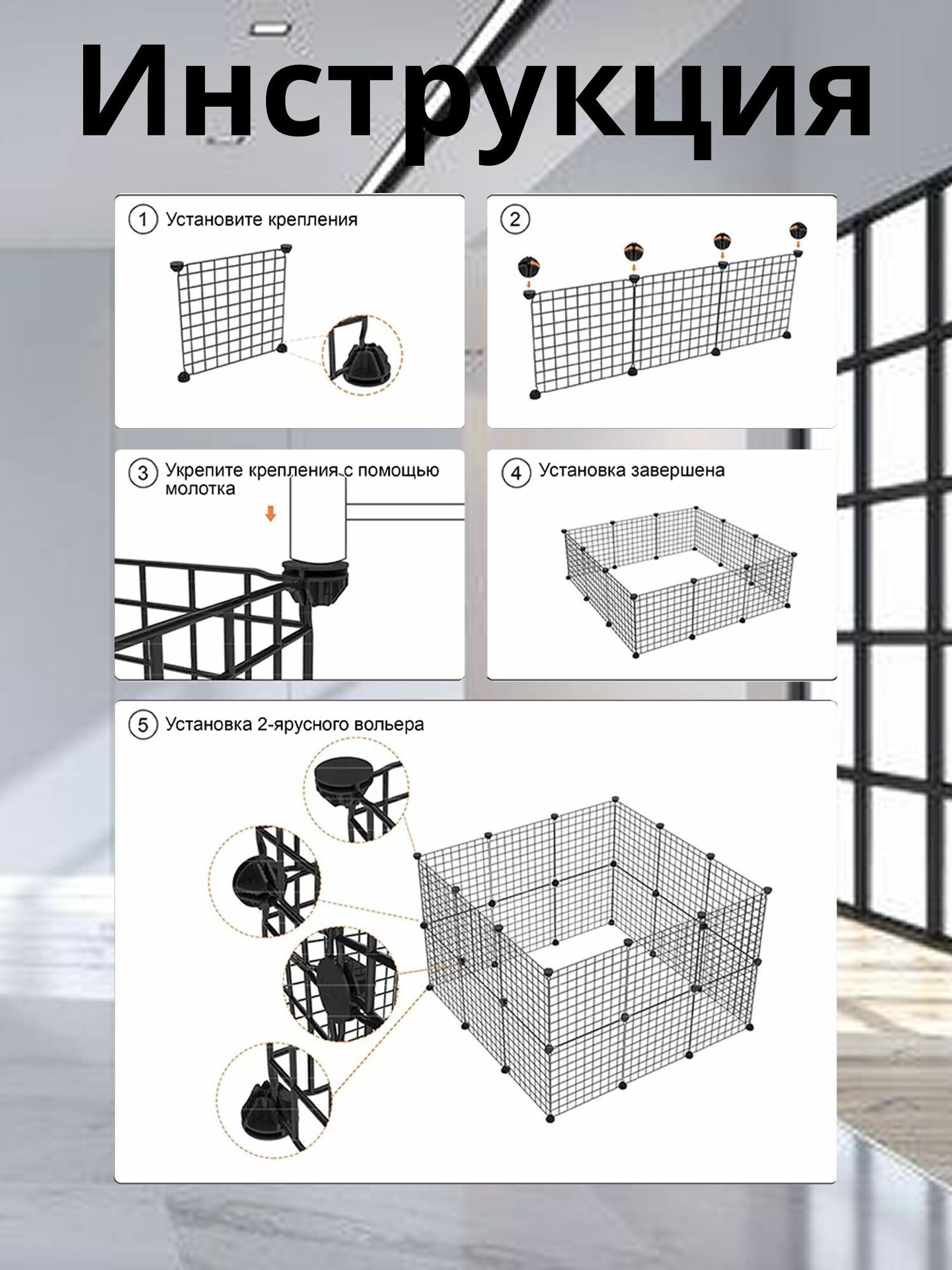 Металлические секции легко собираются в конструкцию нужной конфигурации, что обеспечивает удобство и простоту использования. В комплекте вы найдете 11 металлических секций, 1 секцию с дверью и молоточек для сборки.
