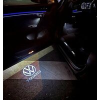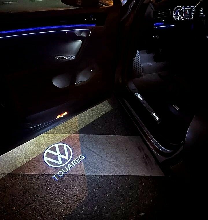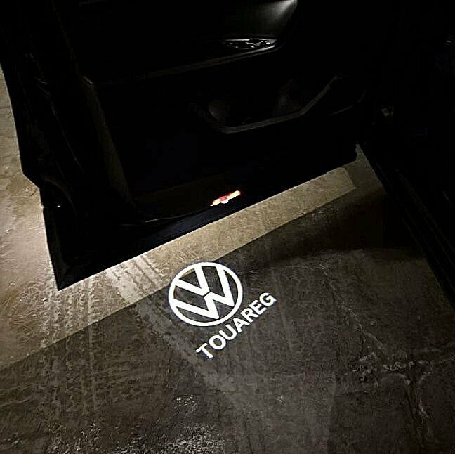 Volkswagen Touareg 1. ДВА (2) плафона премиум в двери для автомобилей Фольксваген Туарег 1 (до 2010 года) с проекцией логотипа Touareg. Стеклянные слайды.