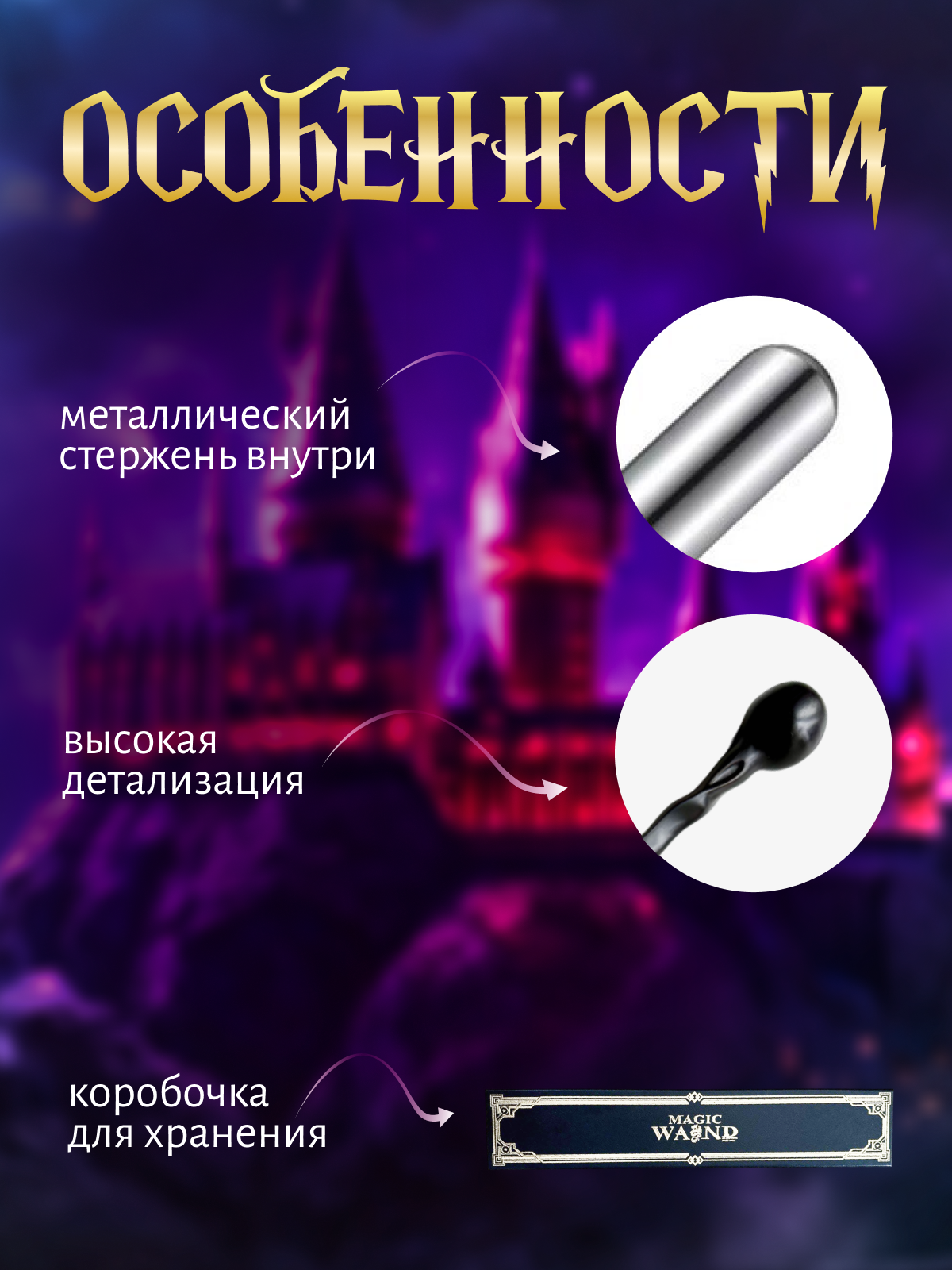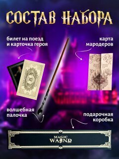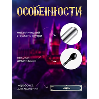 Волшебная палочка любимого героя из вселенной Гарри Поттера поставляется в подарочной коробке с бархатной подложкой и золотым тиснением. Палочка Гарри и др. героев придет вам с подарком: билет на поезд и/или карточка персонажа. В нашем магазине вы можете выбрать волшебную палочку любого персонажа: Гарри Поттера, пожирателя смерти, лорда Волан де Морта, Бузинную палочку Альбуса Дамблдора, Гермионы Грейнджер, Рона Уизли, Люциуса Малфоя, Драко Малфоя, Сириуса Блэка, Беллатрисы Лестрейндж, Флер Делакур, Галлерта Грин де Вальда, Невилла Долгопупса, Ремуса Люпина, Филиуса Флитвика, Полумны Лавгуд, Алекто Кэрроу, Минервы Макгонагалл, Ксенофилиуса Лавгуда. Размер палочки в среднем 40 см, в зависимости от вида. Внутри волшебная палочка Гарри Поттера имеет металлический стержень, что делает ее достаточно весомой. Волшебная палочка - это прекрасный карнавальный аксессуар, отличный подарок всем поклонникам фильма и книги, а также она подойдет для маскарада или косплея. Все палочки сверху покрыты слоем смолы, что делает их долговечными в использовании.