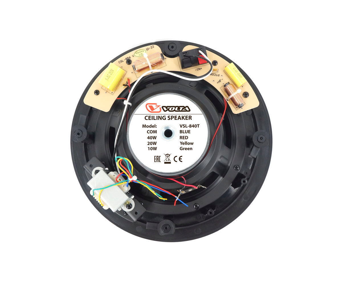 VOLTA VSL-840TB Громкоговоритель потолочный 2-х полосный. Мощность 40 Вт/100 В, отводы трансформатора 40-20-10 Вт/8Ω, 50-20 000 Гц. Цвет черный. Масса: сравнение цен, характеристики, фото, актуальное наличие и цены.