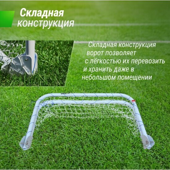 Ворота для мини-футбола UNIX Line станут незаменимым дополнением для всех любителей футбола! Переносные футбольные ворота сочетают в себе легкость и прочность, обеспечивая непревзойденное качество и удобство при использовании. Футбольные ворота для улицы обладают прочной стальной конструкцией, надежно стоят на земле и не заваливаются от ударов мяча! Главное преимущество ворот в том, что для них не нужно скрупулезно выбирать место для стационарной установки. Вы всегда можете передвинуть их на новое место. Такие ворота станут отличным дополнением для игры в футбол на даче или во дворе частного дома. Если вы не обладаете большим пространством, после игры ворота можно перенести к забору и снова освободить место. Благодаря компактным размерам и складной конструкции, вы сможете легко брать их с собой куда угодно и играть в футбол в любом месте! Лаконичная конструкция металлических футбольных ворот делает их легкими в сборке. Переносные футбольные ворота превратят обычную игру в настоящий футбольный матч! Проводите время за активной игрой с друзьями или детьми и создавайте яркие воспоминания! Больше не нужно придумывать импровизированные ворота и сооружать их из подручных средств. Позвольте себе погрузиться в атмосферу настоящего футбольного азарта с качественными футбольными воротами UNIX Line! Характеристики: