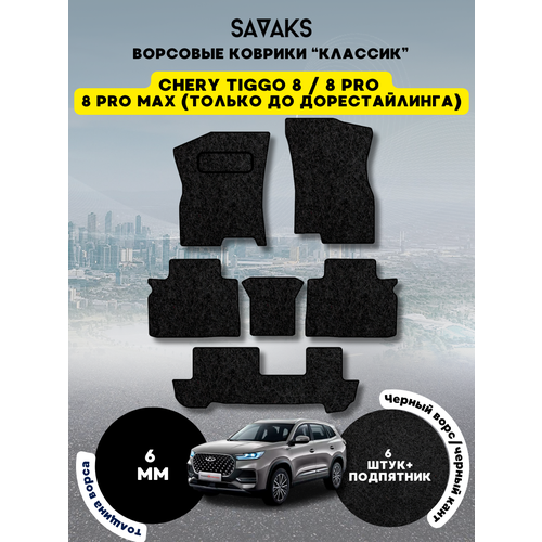 Ворсовые коврики классик 6 мм для Chery Tiggo 8, 8 PRO, 8 PRO MAX (только дорест) на 3 ряда, Chery Tiggo 8 2018 — н. в. Chery Tiggo 8 Pro 2021 — н. в. Chery Tiggo 8 Pro Max 2022 — 2024 до рестайлинга; Чери Тигго 8 (Тиго 8 Про и Про Макс)Ворс