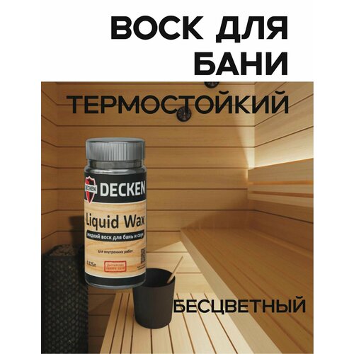 Воск для бани DECKEN -термостойкое средство премиум класса на основе тунгового масла и натуральных восков карнауба и канделилла для обработки деревянных элементов и поверхностей в парных, банях и саунах, в том числе полков. Воск применяется для защиты поверхностей из твердых и мягких пород древесины, в том числе и термообработанной, пробки и т. д. Защищает древесину от воздействия высоких температур, пара, придает поверхности водо- и грязеотталкивающие свойства.